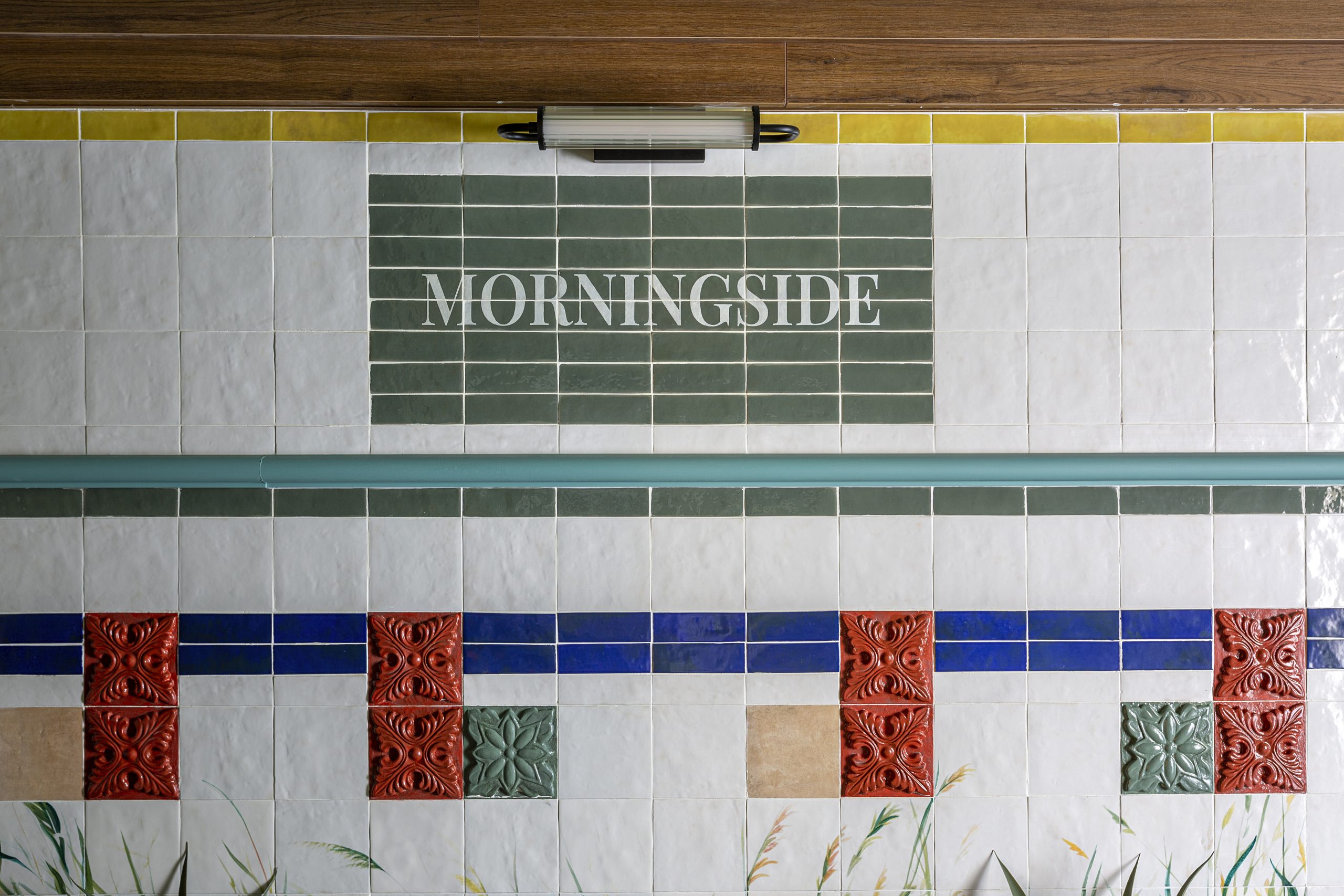 Cabe también a destacar el trabajo de lettering realizado para el título “MORNING SIDE” que aparece en el espacio. Para tener un alto grado de detalle y calidad, los artistas del Atelier crearon un vinilo que funciona con una reserva, que posteriormente han rellenado con un pigmento cerámico blanco.
