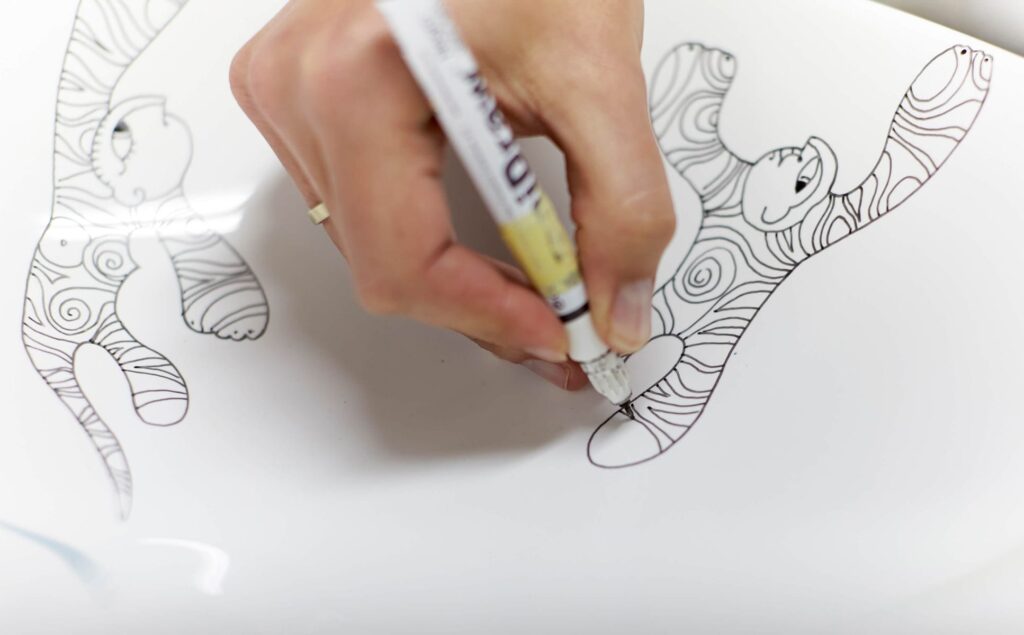 A mano alzada, este artista, pinta las figuras que aparecen en sus piezas. Después las colorea en negro, gris, verde o azul con la técnica del esponjado y retira la pintura sobrante para lograr líneas depuradas. Una vez que Adri termina de pintar el lavabo, este pasa por un proceso de horneado y secado y, posteriormente se embala con mimo.