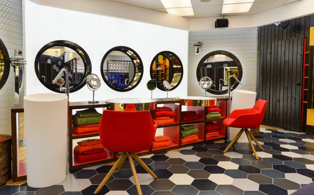El aseo central de la casa más mediática se caracteriza por la mezcla de estilos y materiales; los azulejos conviven con la madera y el papel pintado en una gama de colores muy amplia. Colores vivos como el rojo y el verde se fusionan con la sobriedad y ele-gancia del blanco y negro.