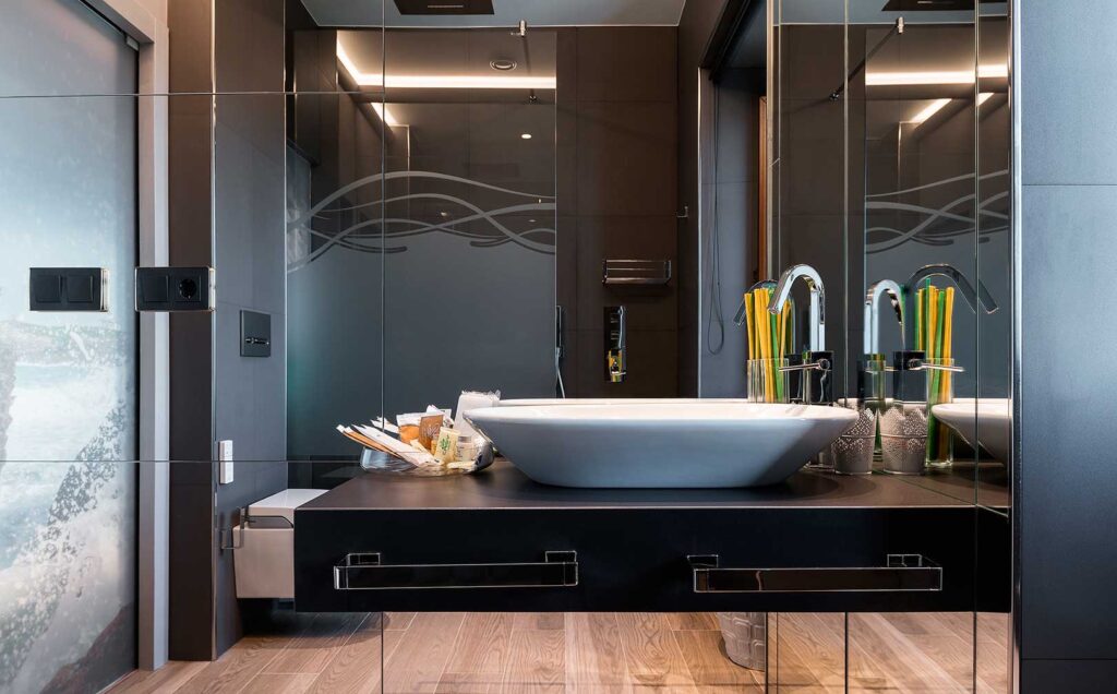 El proyecto ha distribuido el faro en dos apartamentos turísticos de 40 m2 cada uno que incluyen jardín individual, dormitorio doble, salón, cocina americana y baño equipado con el lavabo New Toulouse de Bathco pintado a mano por los artistas de Bathco Atelier que han plasmado el faro en la porcelana.