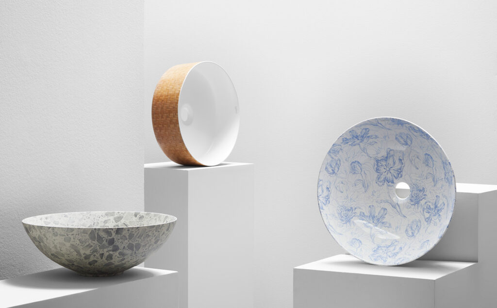 La empresa especializada en el sector del baño busca la inspiración en las formas naturales y las fibras para crear nuevas calcas cerámicas que decoran lavabos de porcelana. Estas calcas se aplican de forma artesanal en el taller de la compañía para poner en valor lo hecho a mano.
