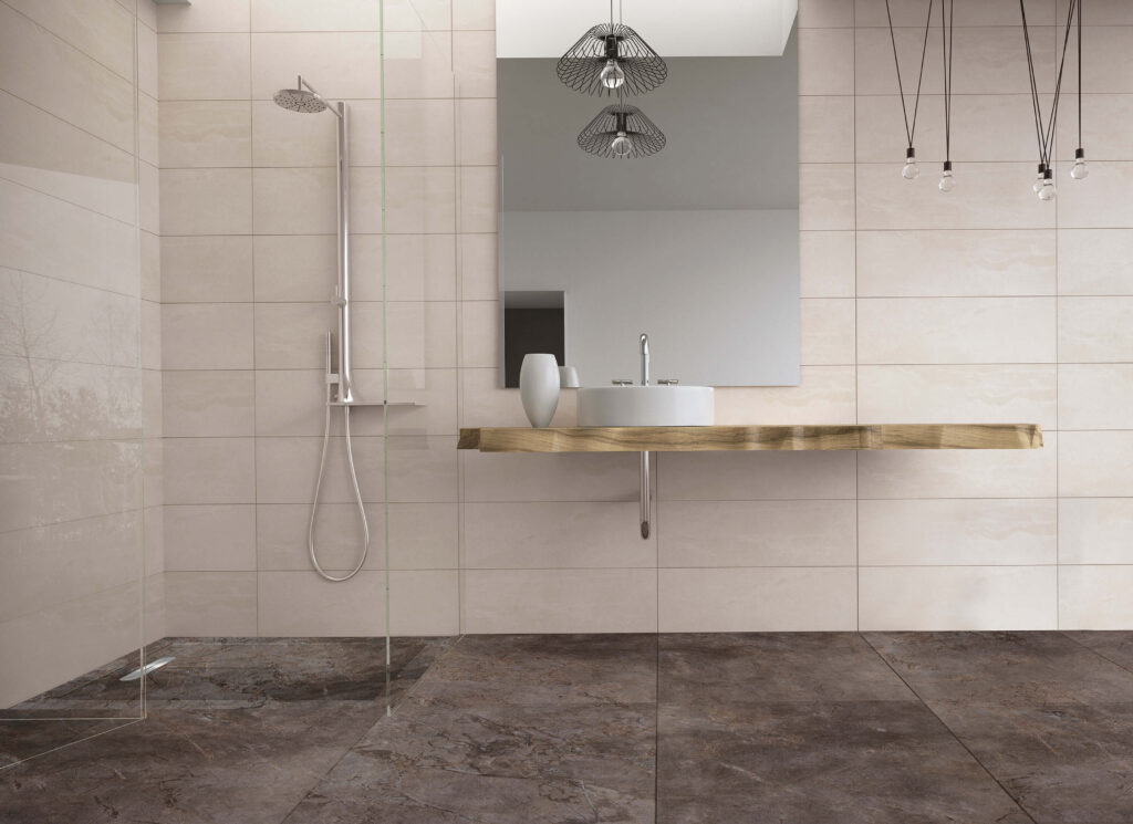 Las líneas rectas y las formas geométricas se combinan a la perfección con texturas y colores cálidos en una colección que reinterpreta el cuarto de baño.