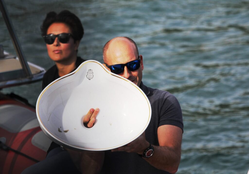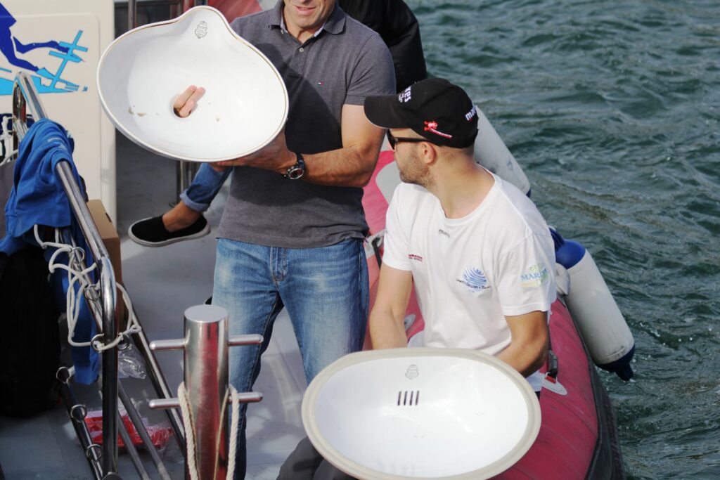 A la una y media de la tarde, los invitados al evento embarcaron en un catamarán que les llevó frente al muelle de Gamazo para presenciar lo que ocurriría a continuación. Tanto desde tierra como desde el mar, muchas personas se acercaron para ver en primera línea el descubrimiento de las reproducciones de los lavabos del Titanic. Hombres y mujeres vestidos con atuendos de principios de siglo XX vivieron el momento como auténticos pasajeros del Titanic, la música envolvió a los asistentes y a través de pantallas gigantes se presenciaron las imágenes del momento. Junto a los restos del remolcador hundido San Martín, un equipo de submarinistas se sumergió para rescatar las piezas que más tarde se mostrarían en el CEAR de Vela junto a los muebles, la grifería, las toallas y el albornoz, todo reproducido de forma fiel a lo que los pasajeros encontraron en sus camarotes en 1912.