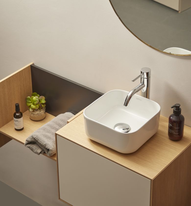 The collection of mini washbasins includes a wide variety of shapes and sizes, ranging from smooth, rounded lines to straighter, more contemporary geometries. Within this extension, the Cube model stands out, available in different sizes and finishes, which becomes one of the most versatile options for integrating into all kinds of projects.