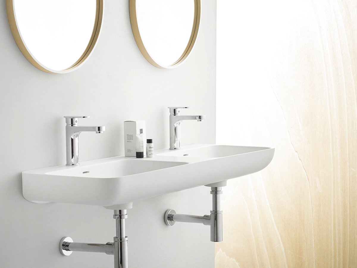 A rectangular solid surface washbasin with double bowl, designed for countertop installation. It combines strength, purity of lines and contemporary aesthetics, ideal for contract projects.