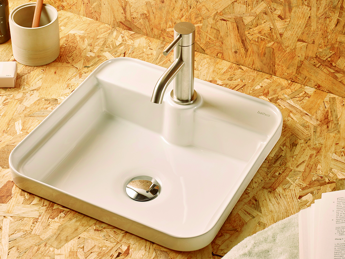 El diseño cuadrado se interpreta con pureza contemporánea. Fabricado en porcelana blanca con acabado brillo, este lavabo puede instalarse sobre encimera o en semiencastre, ofreciendo versatilidad y una estética limpia.