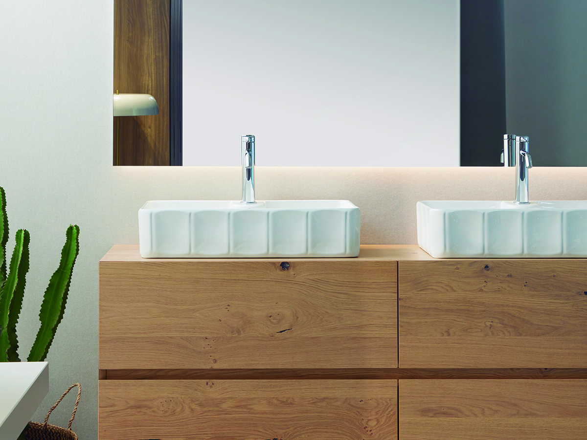 La versión en porcelana brillo ofrece un trazo más nítido. Rectangular de sobre encimera para un baño ordenado y actual.