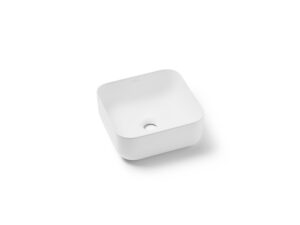 Formato mini y planta cuadrada en porcelana brillo. Un lavabo de sobre encimera pensado para optimizar el espacio sin renunciar al diseño.