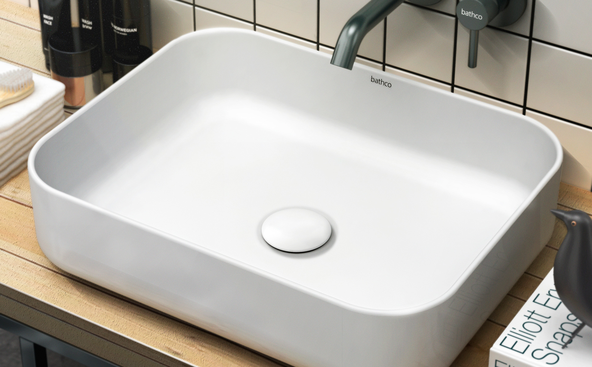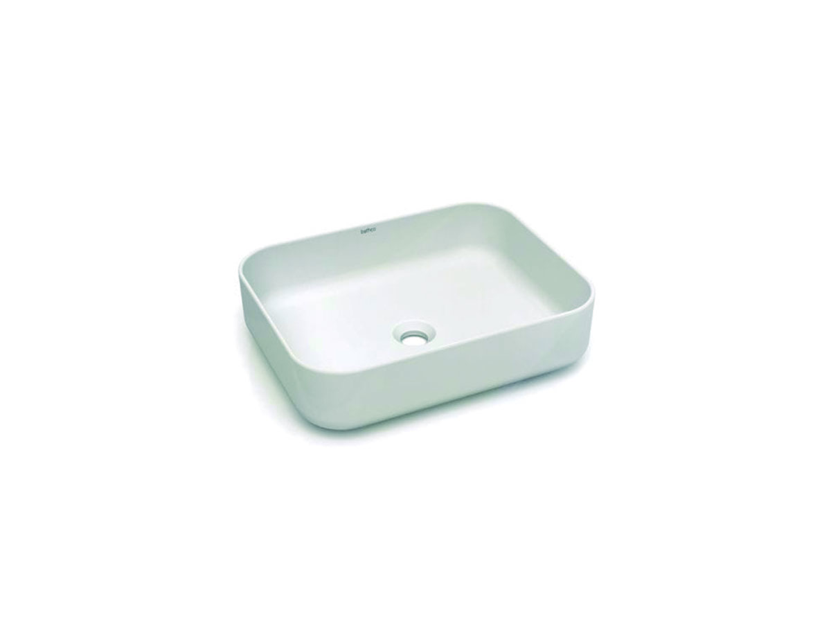 A rectangular design in matte white porcelain softens the aesthetics. A rectangular countertop sink designed for serene and contemporary spaces.