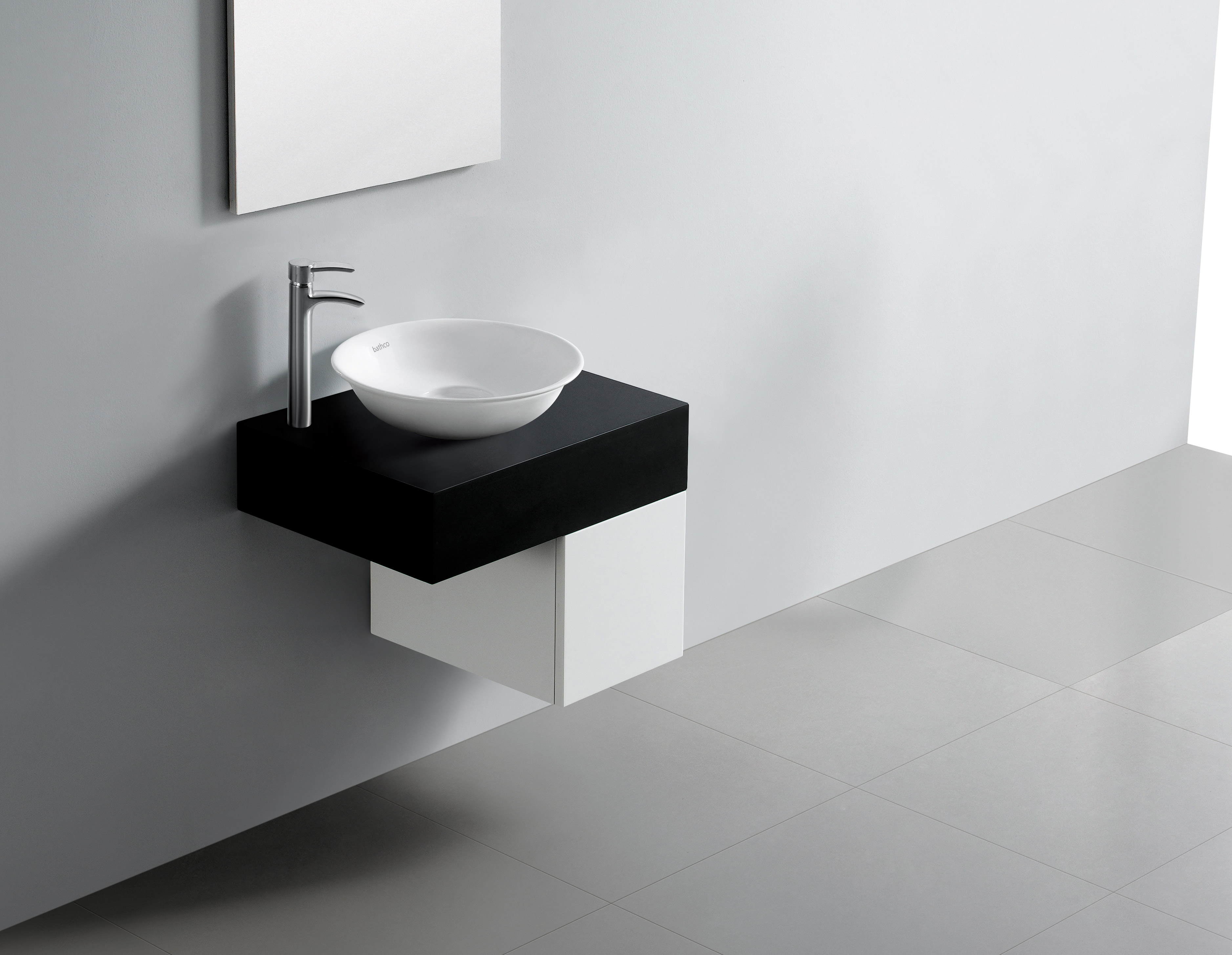 Encimera de madera en formato compacto, acabada en negro. Una pieza sencilla y duradera para baños pequeños.