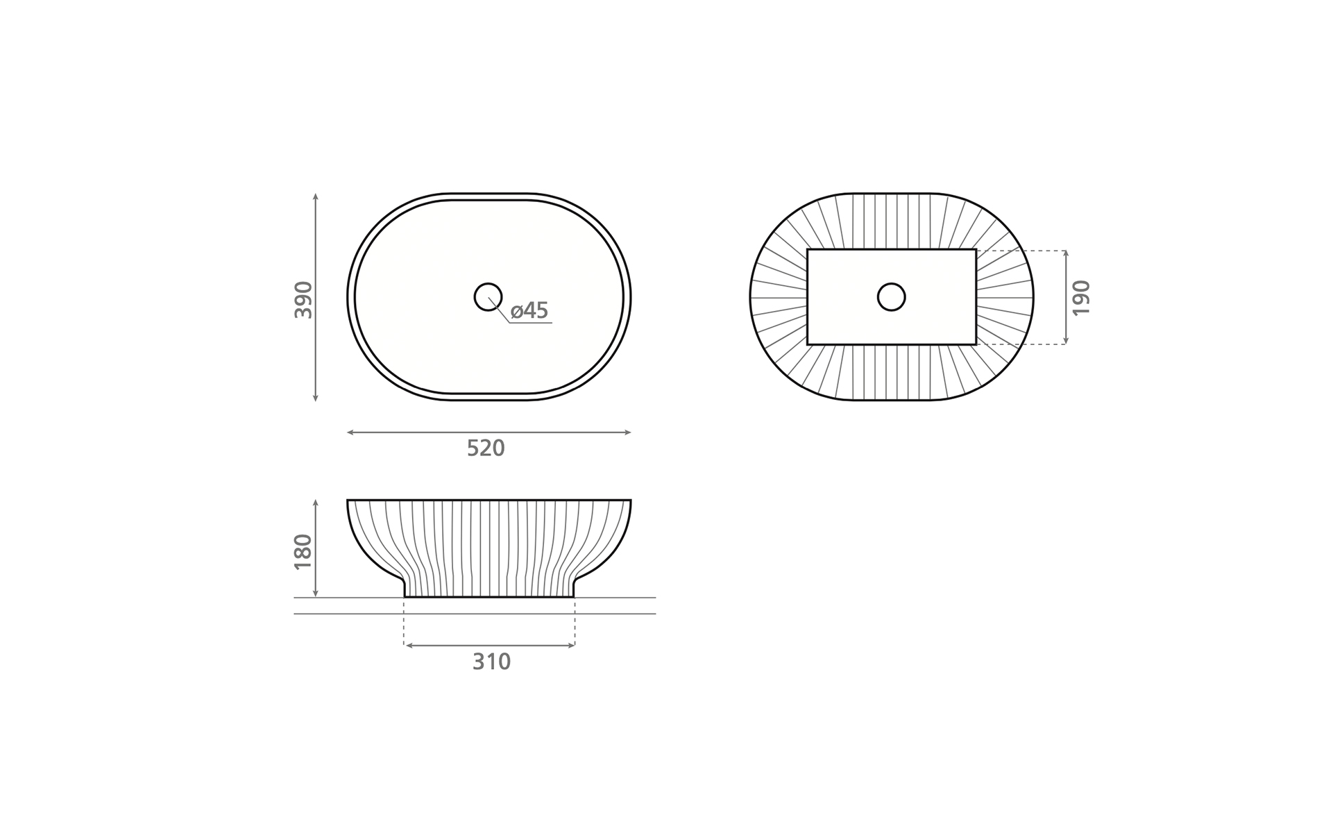 A metallic finish that adds contained shine. Oval format in solid surface for a contemporary presence.