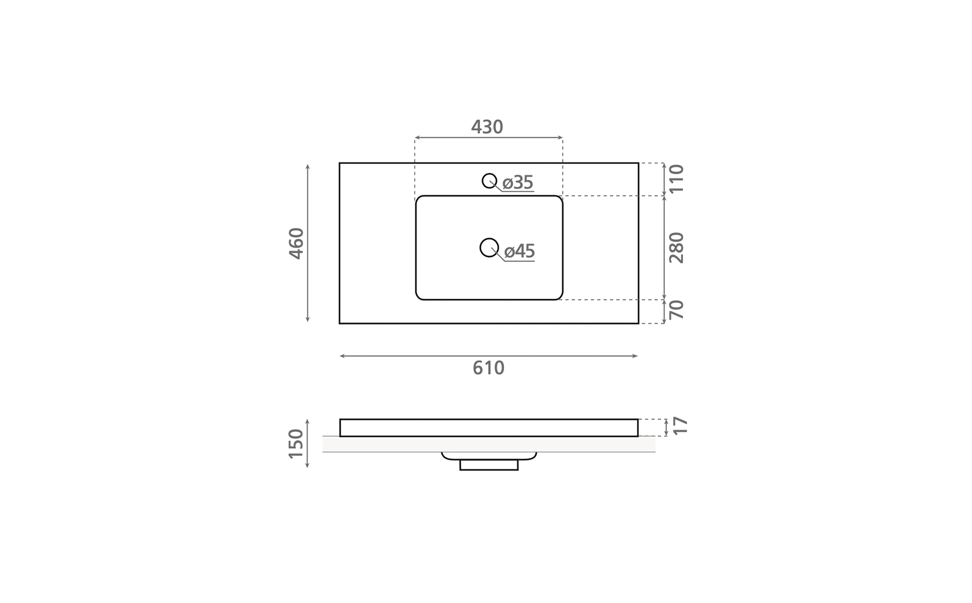 Lavabo rectangular en porcelana brillo, de instalación sobre mueble. Disponible en varias medidas, incorpora rebosadero y aporta proporción equilibrada.