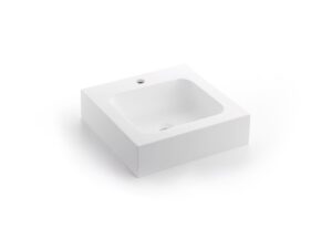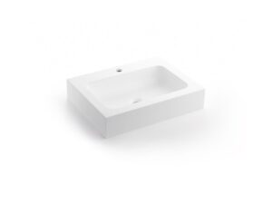 Lavabo rectangular o cuadrado de sobre encimera, fabricado en solid surface blanco. Una propuesta versátil y duradera, pensada para baños contemporáneos.