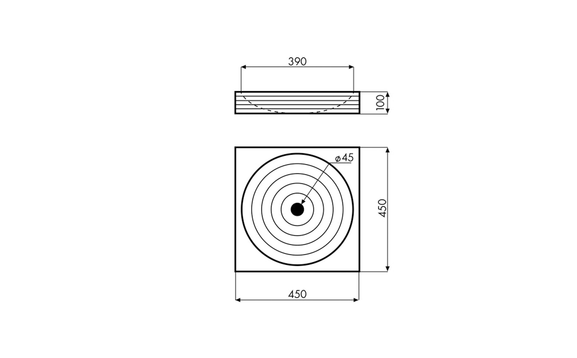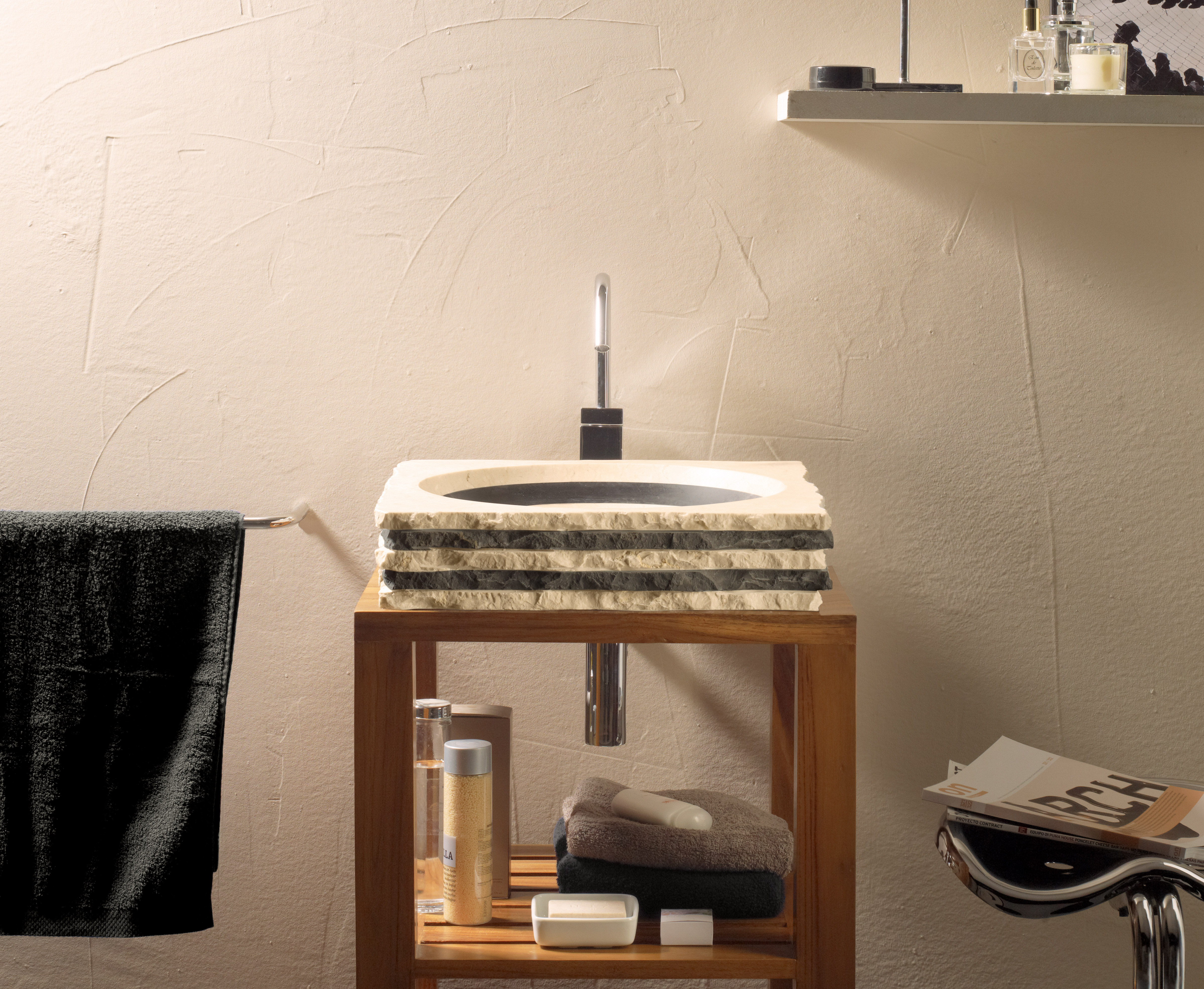 Lavabo cuadrado en piedra natural, disponible en beige o negro. Su formato compacto refuerza la fuerza del material.