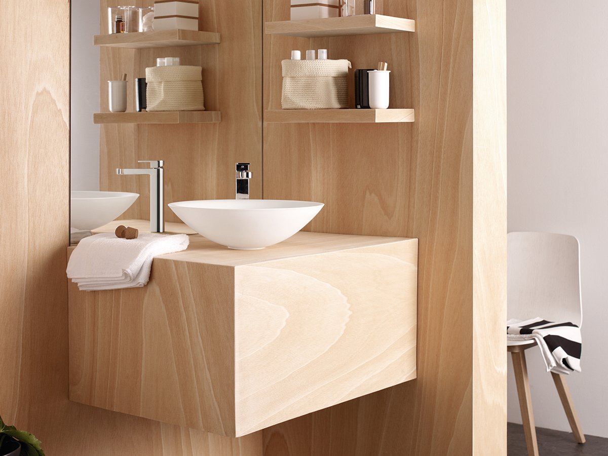 Circular solid surface washbasin in white, with a smooth and continuous surface that reinforces the purity of its design. A light and versatile piece for contemporary projects.