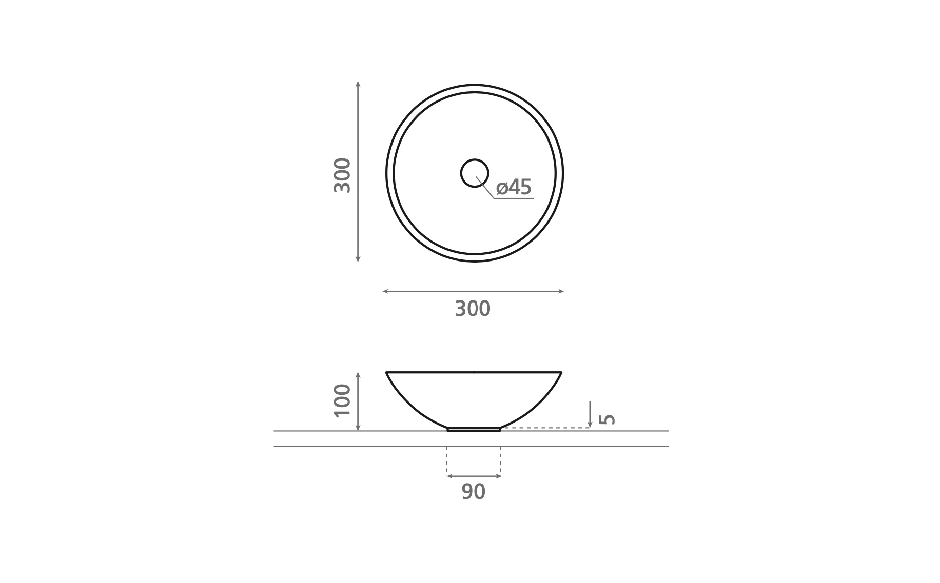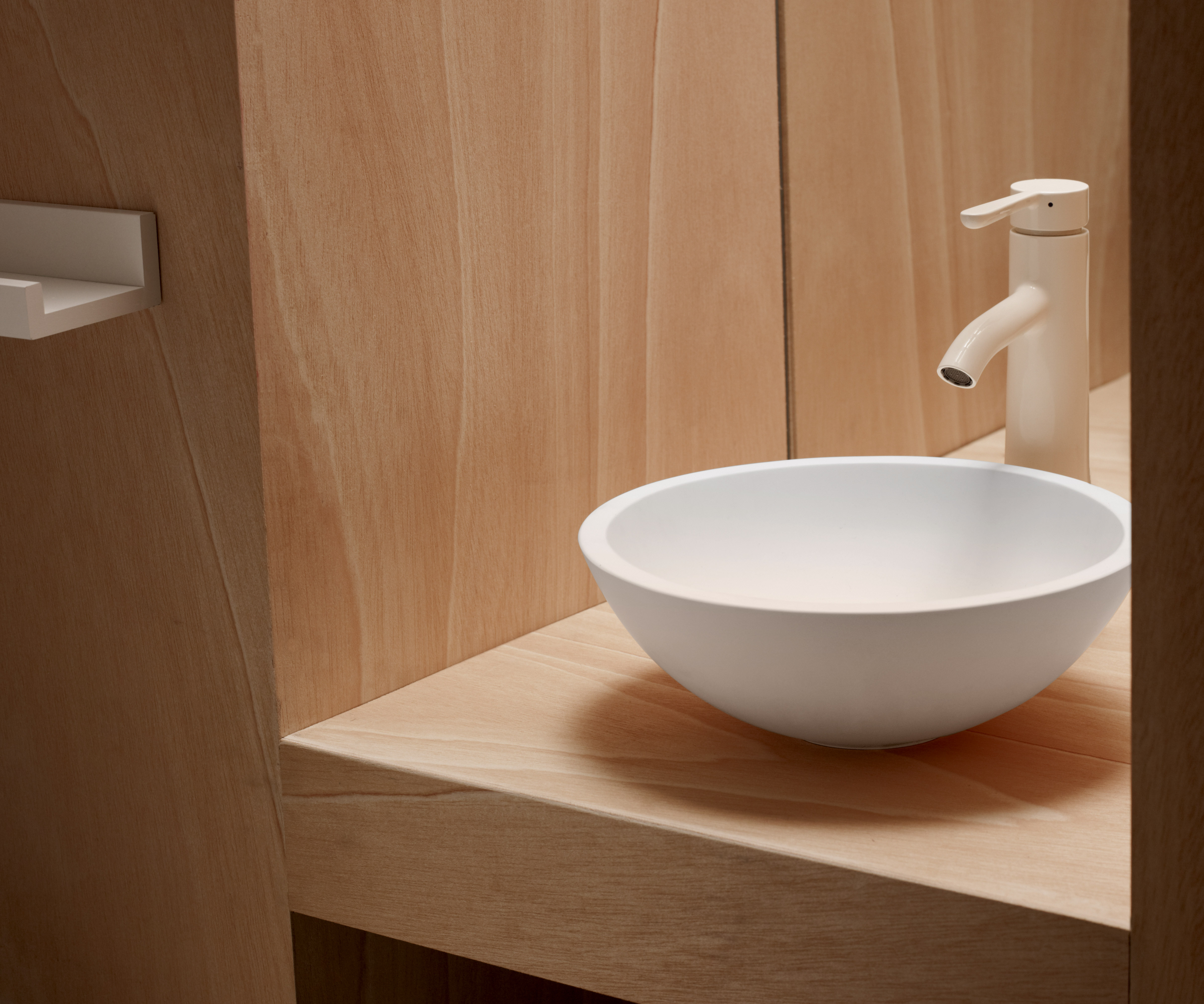 Lavabo circular en solid surface blanco. Su diseño esencial y su formato reducido lo convierten en una opción versátil y actual.