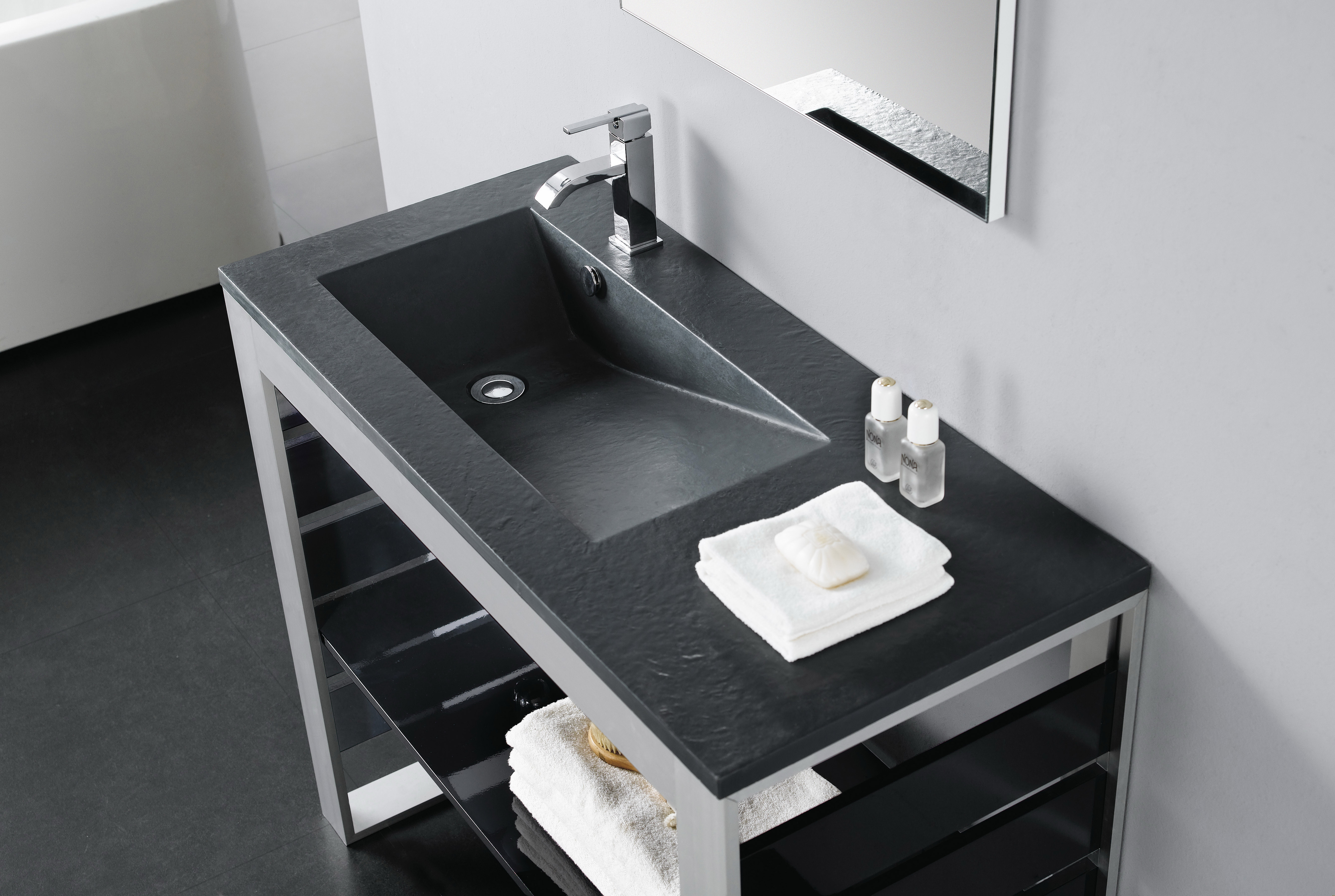Lavabo en resina con acabado negro pizarra aporta un carácter más rotundo y sofisticado. Ideal para crear contraste con encimeras claras o materiales naturales.