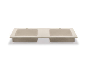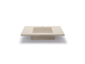 Rectangular cement washbasin in terrazzo version, which introduces a decorative nuance with its mottled surface.