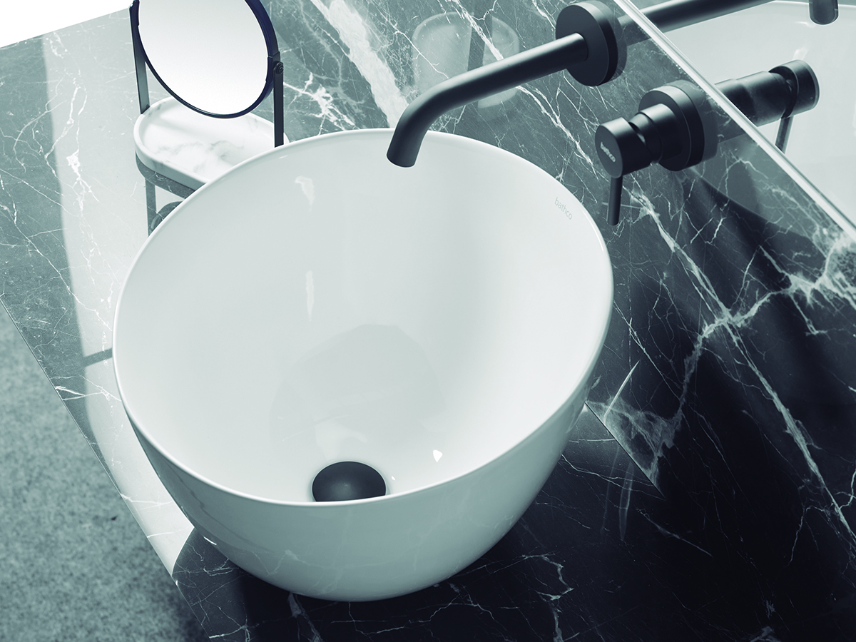 A circular porcelain washbasin available in glossy white, matte white or matte black finish. Designed for countertop, it brings sobriety and versatility.