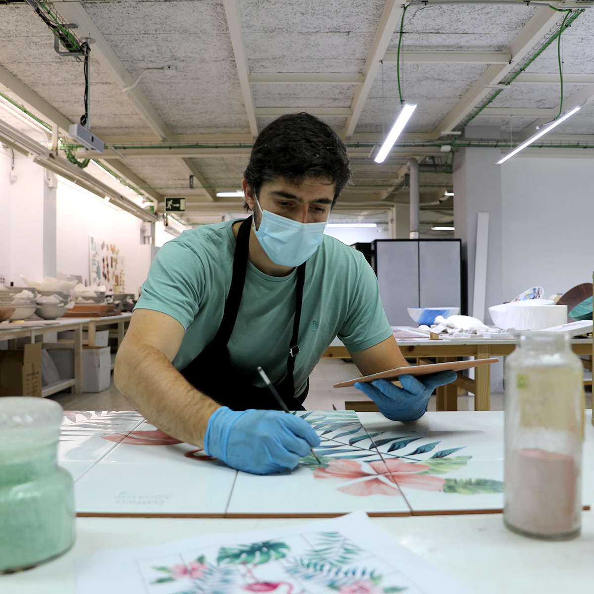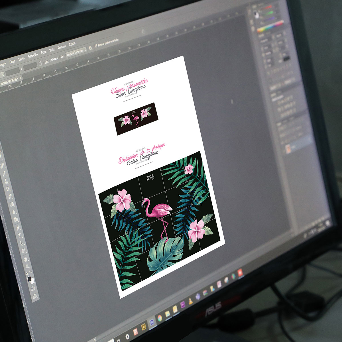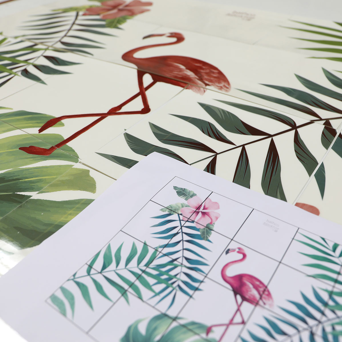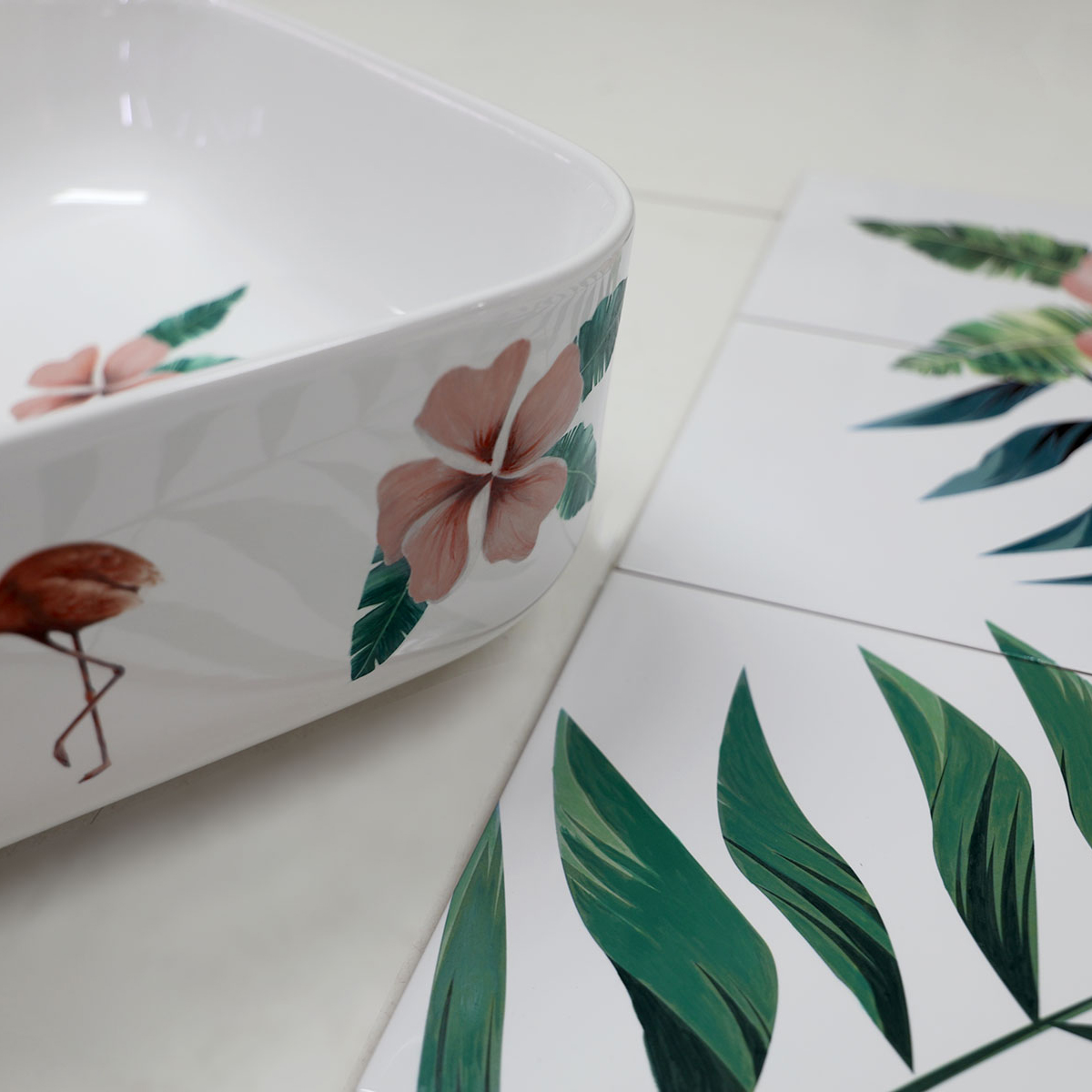 AtelierPara ambientar un stand de Aquatop by JS, cliente de Bathco en Rennes, el equipo pensó en el trabajo que los artistas realizan en Bathco Atelier y solicitó un diseño que se pudiese aplicar tanto en un mural como en un lavabo. Los artistas decidieron crear una ambientación tropical donde se combinase la vegetación y los flamencos rosas. Ese diseño se aplicó a un mural formado por azulejos de 40 x 40 cm. así como al lavabo de porcelana New Lys.
