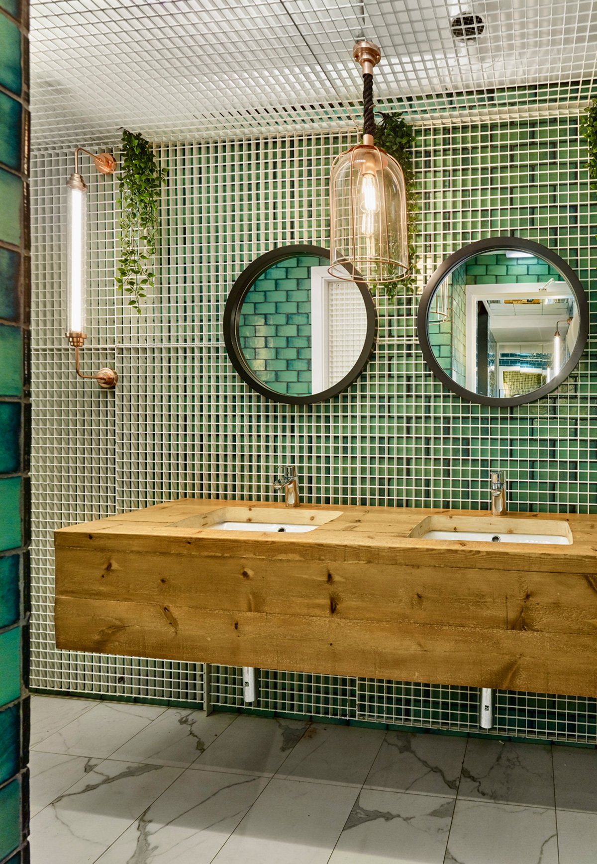 Cuando el verde se utiliza en azulejo o superficie continua, se convierte en la base estructural del baño.