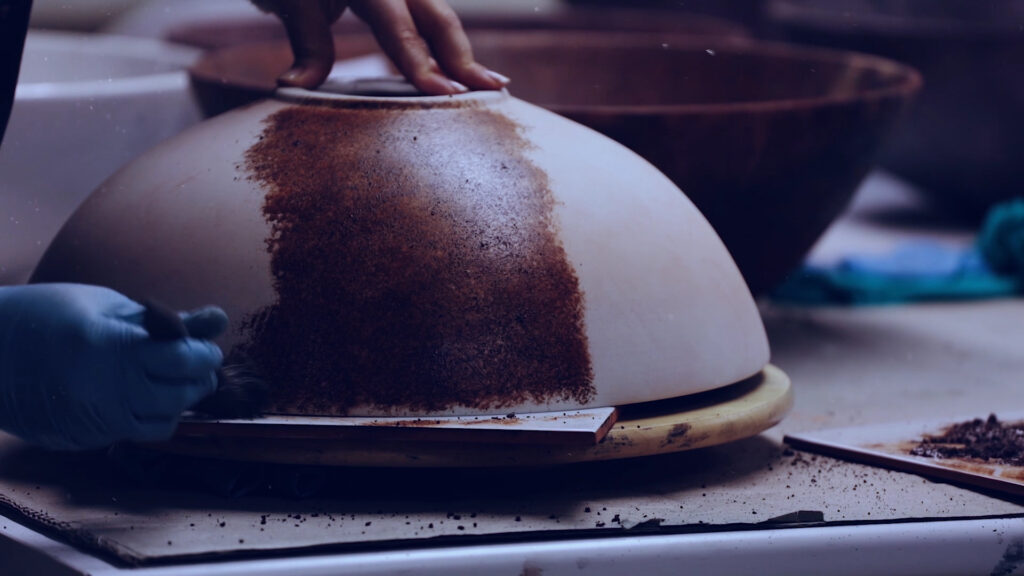 Para poder realizar este acabado. Se parte de un lavabo de porcelana sin esmaltar, lo que se denomina “porcelana cruda” y se somete a un proceso totalmente artesanal divido en dos fases.