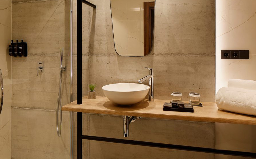 Su renovación y modernización cambió radicalmente su imagen, eligiendo productos de calidad y estéticamente atractivos. Adquirió gran importancia el mármol, muy presente en los baños de las habitaciones donde se puede ver el lavabo rectangular Olea de Bathco.