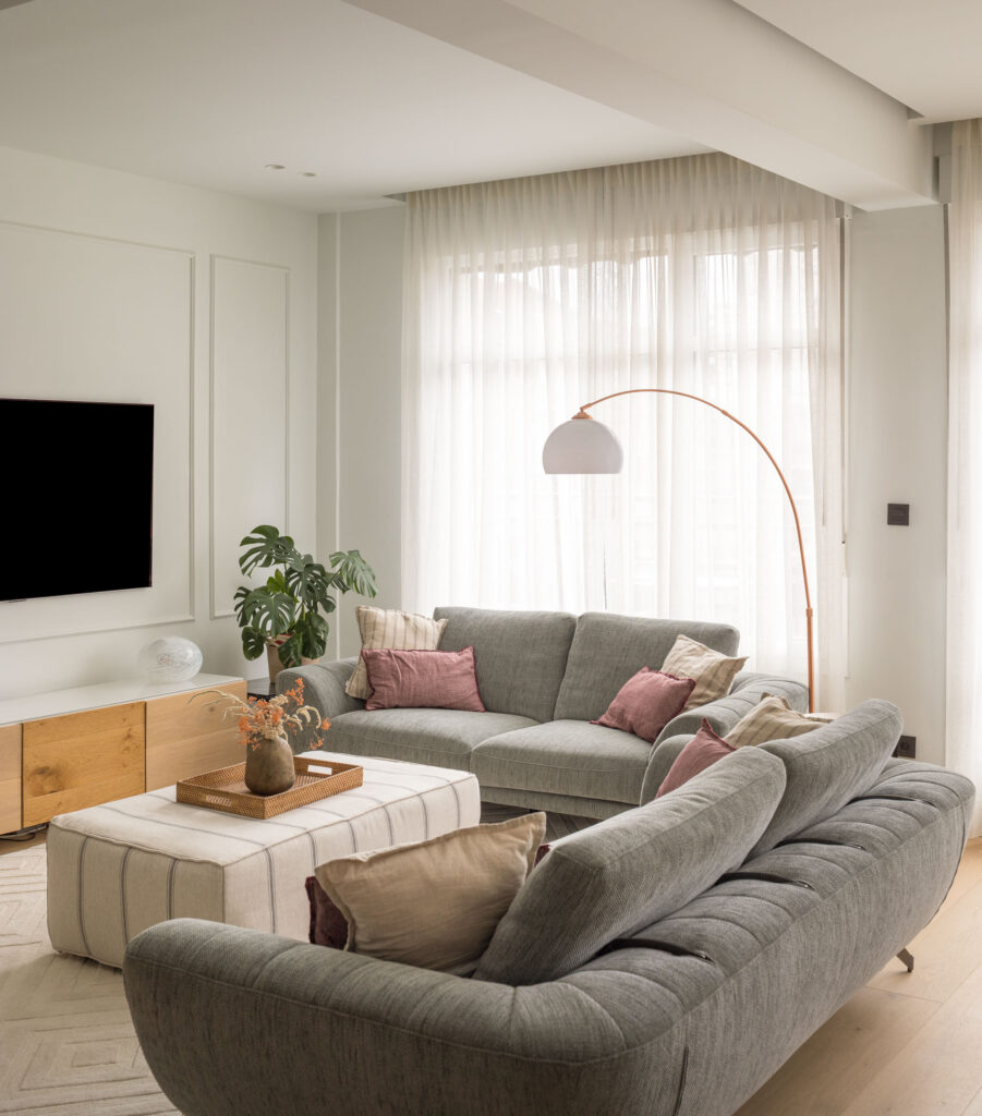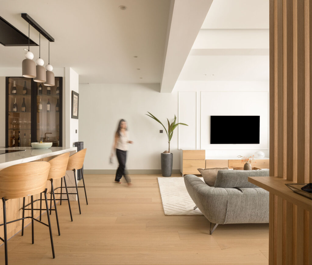 La madera de roble se convirtió en un elemento central en toda la vivienda, y cubrió todo el suelo. El salón, decorado con sofás en un tono gris verdoso, una alfombra en tonos crudos y un puf central, mantuvo la estética general de la vivienda.