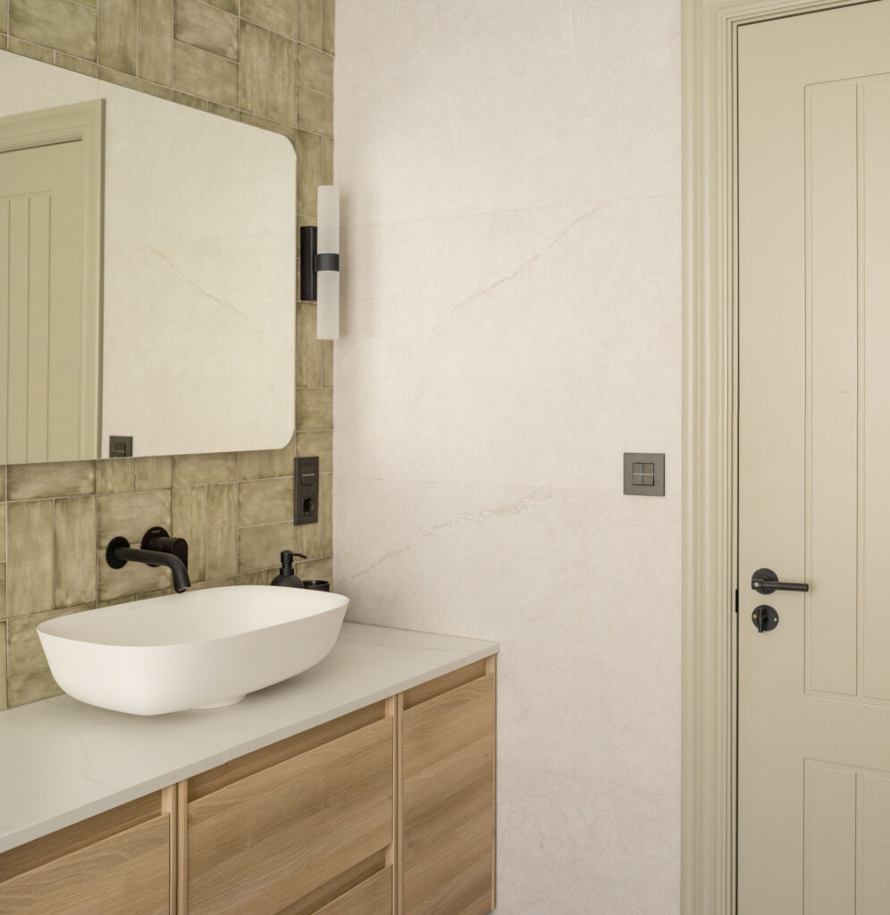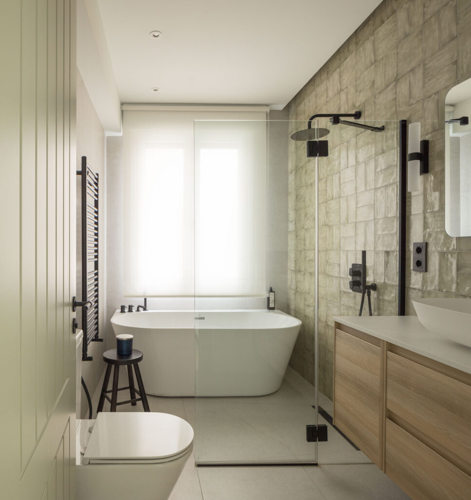 Sin embargo, el baño principal de la vivienda merece un lugar especial en esta transformación. Un gran ventanal al fondo inunda el espacio de luz natural, lo que permitió la inclusión de una bañera y una ducha, un lujo si se tienen niños en casa. Las paredes se revistieron con piezas cerámicas de gran tamaño en un elegante color gris, complementadas en la parte frontal del baño con azulejos de color verde. Para añadir un contraste impactante, se optó por grifería, mecanismos y apliques en color negro. El mueble de roble con una encimera color claro y el lavabo modelo Tucuman de Bathco completaron este espacio impresionante.