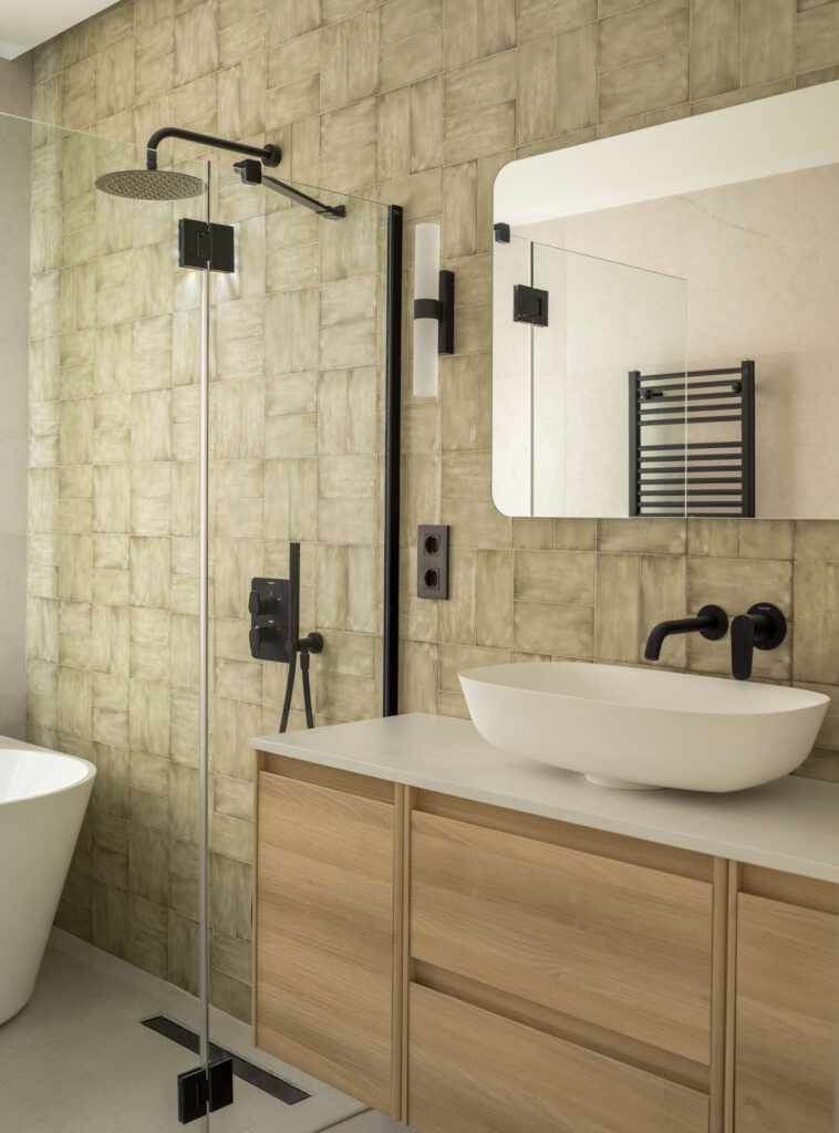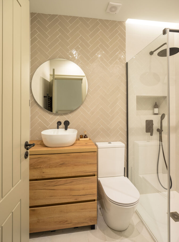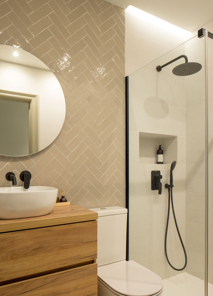 El segundo baño siguió una estética similar, aunque con tonos más claros, dado que carecía de iluminación natural. Se utilizó un azulejo beige dispuesto en espiga, combinado con piezas cerámicas de mayor formato en color blanco. La elección de la grifería en negro, un mueble de roble y el lavabo Olea de Bathco aportaron un toque de elegancia a este segundo espacio.