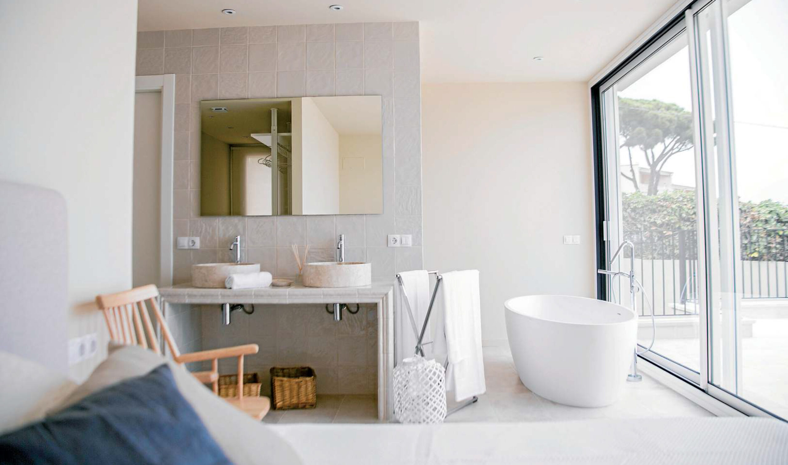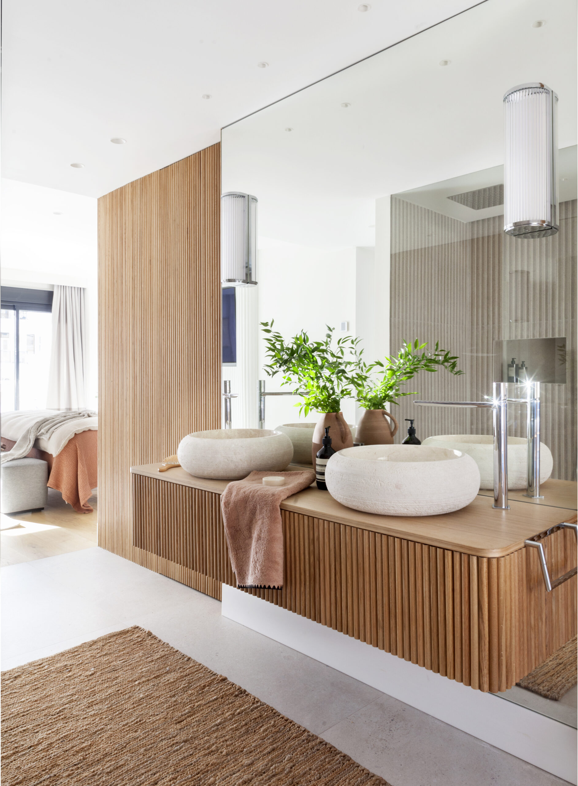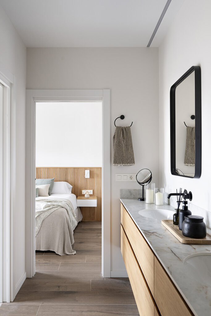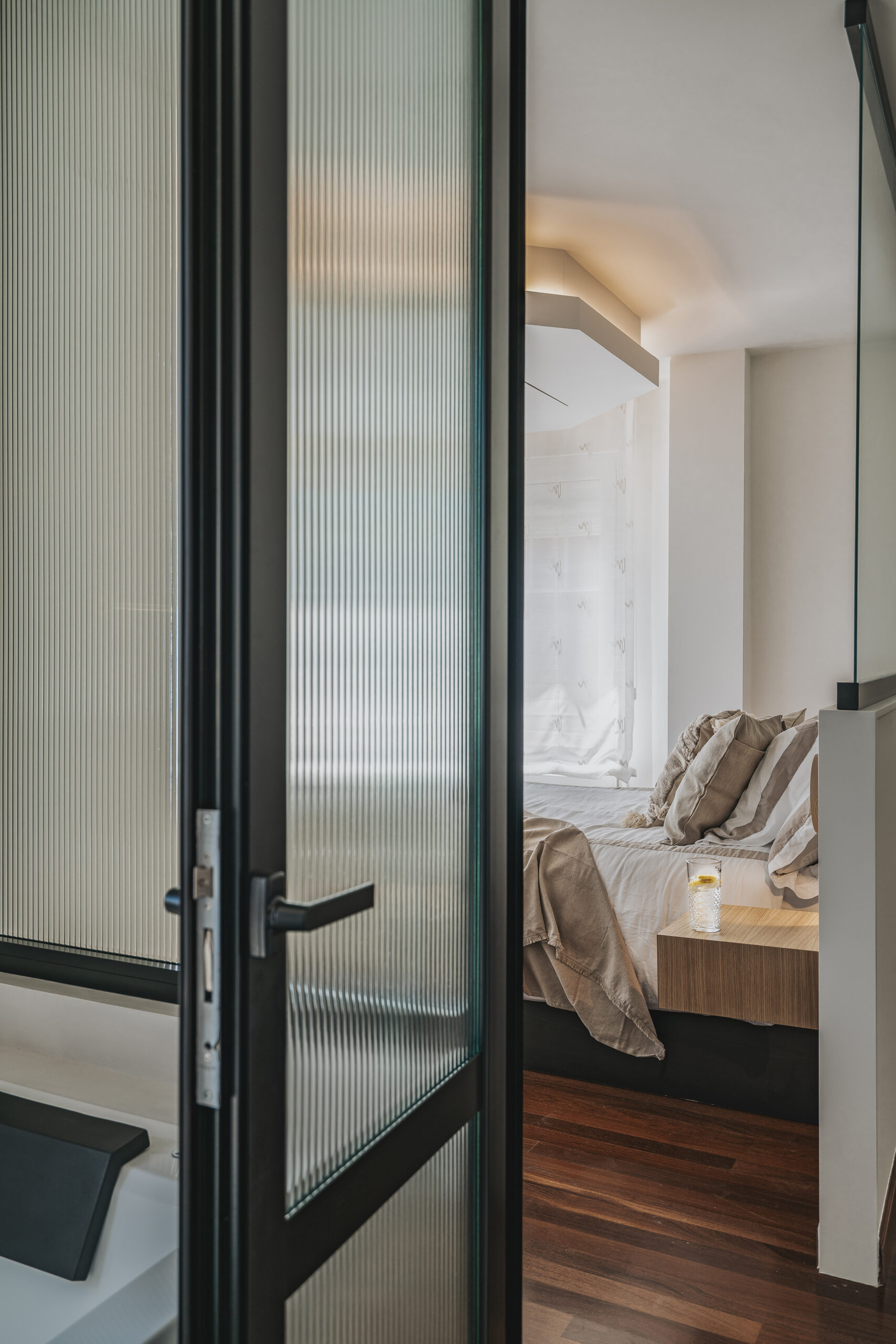 Otra alternativa es tener el típico baño en suite, pero sin perder la conexión con el resto del dormitorio. La puerta es la clave para aportar este equilibrio entre luminosidad y privacidad. Las puertas semiabiertas o de cristal translucido. permiten mantener la conexión visual mientras se garantiza un nivel de privacidad adecuado.