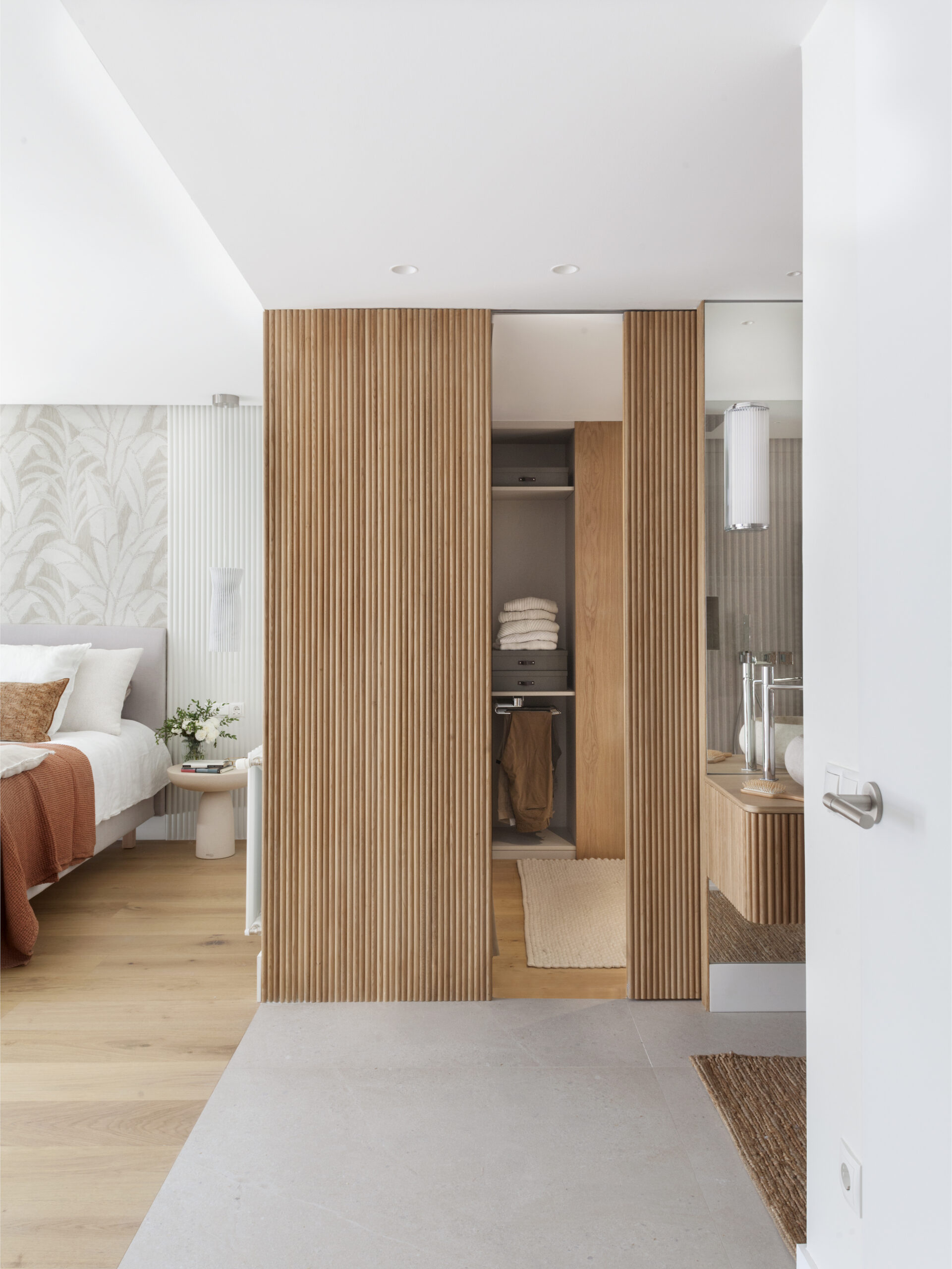 Un diseño más fluido conecta el dormitorio con el baño mediante un pasillo abierto, sin puertas. Esto aporta una transición natural y unifica ambos espacios.
