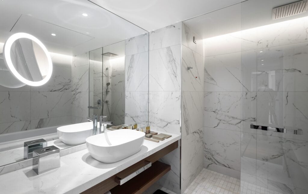 En la renovación, adquiere gran importancia el mármol, muy presente en los baños, en el hall y el lounge del edificio. Para este proyecto, el equipo de arquitectos e interioristas eligió el lavabo rectangular Olea de Bathco para equipar los baños de las habitaciones del hotel.