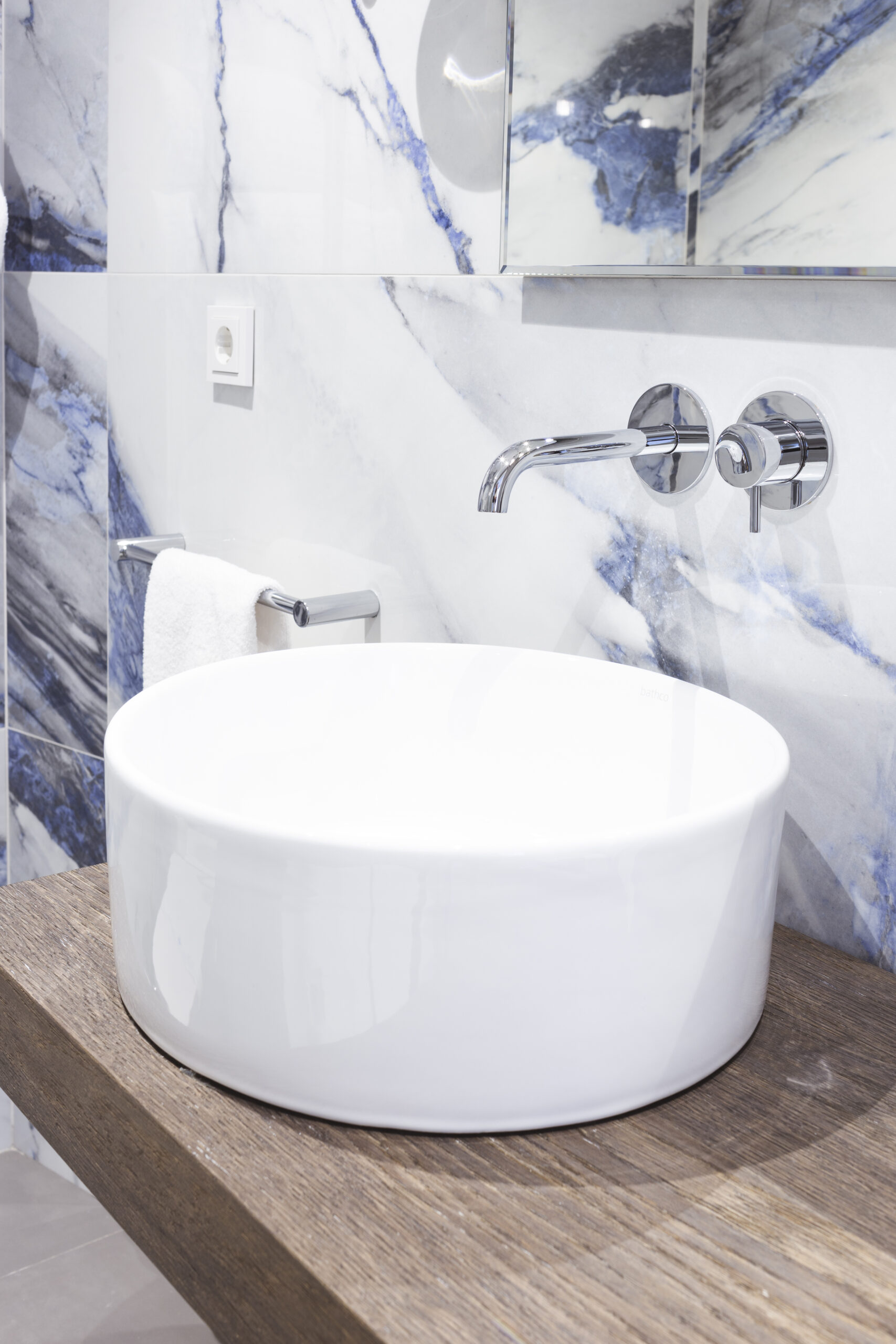 La sencillez del lavabo Dinan se ensalza de nuevo en el baño de Atlantic para el que se escogió una encimera de madera y azulejos marmoleados en tonos azules y grises para las paredes.
