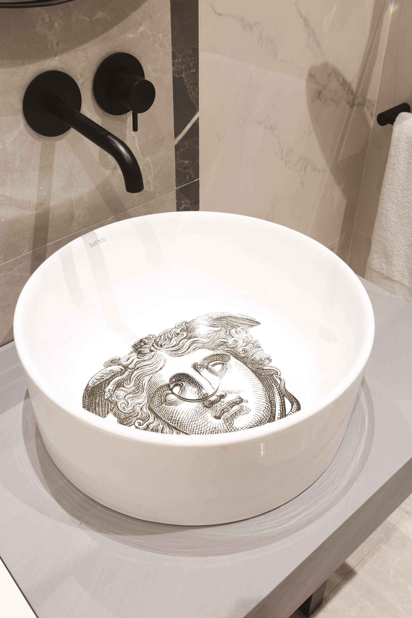 En este caso, la diseñadora quería que se representase el medallón de Hermes (Mercurio). Para ello, se hizo un diseño en formato digital, se imprimió en calcas cerámicas y se decoró haciendo coincidir el dibujo del lavabo con el de la válvula. De esta manera el visitante apreciará el dibujo completo durante el aseo.