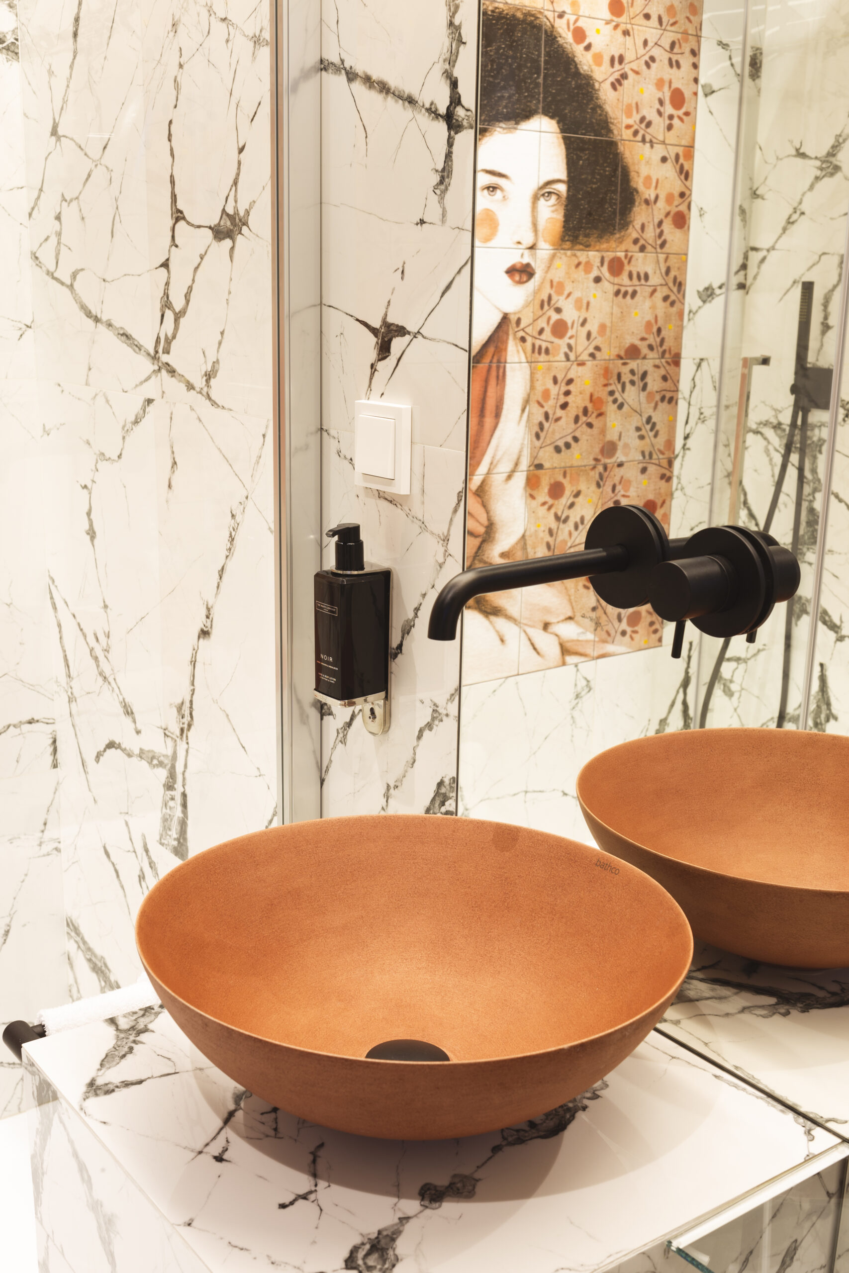 La habitación 306 Anastasia guarda uno de los murales realizados por los artistas de Bathco Atelier basado en la ilustración “Anastasia” de Sofia Bonati y se escogieron los tonos principales para crear el lavabo de porcelana recubierto en microcemento teja creado también en el taller de la compañía.