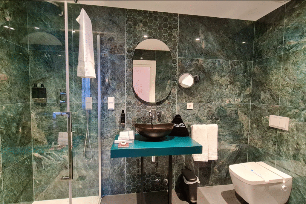 Si nos adentramos en los baños de las habitaciones veremos espacios únicos, cuidados, originales… y es que la selección de los materiales no fue casual. Cada una de las piezas fue escogida por la idiseñadora de forma meditada para crear ambientes con sentido y en este proceso fue fundamental el asesoramiento Andrés Navedo, responsable de exposiciones en Lostal, uno de los distribuidores oficiales de Bathco en Cantabria.