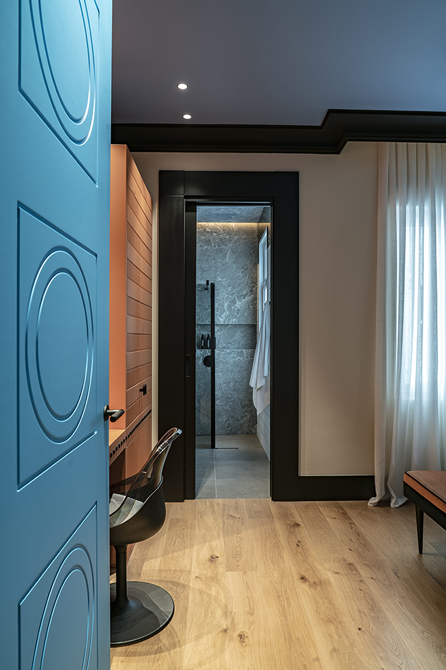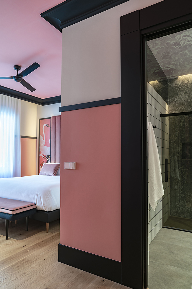 El baño en suite del dormitorio principal es una obra de arte en sí mismo, con toques de rosa y blanco. Al igual que la habitación, que reflejan la esencia moderna y sofisticada de la residencia. El inodoro negro de Bathco añaden un toque de elegancia, mientras que el lavabo diseñado por el Atelier de la misma marca, añade un toque de luz y estilo. “El lavabo está inspirado en el remolino del cambio de Bilbao, de unos trazos negros significativos a la industria de Bilbao, a una explosión de arte, colores y luz. De un Bilbao de amplia oferta gastronómica y cultural».