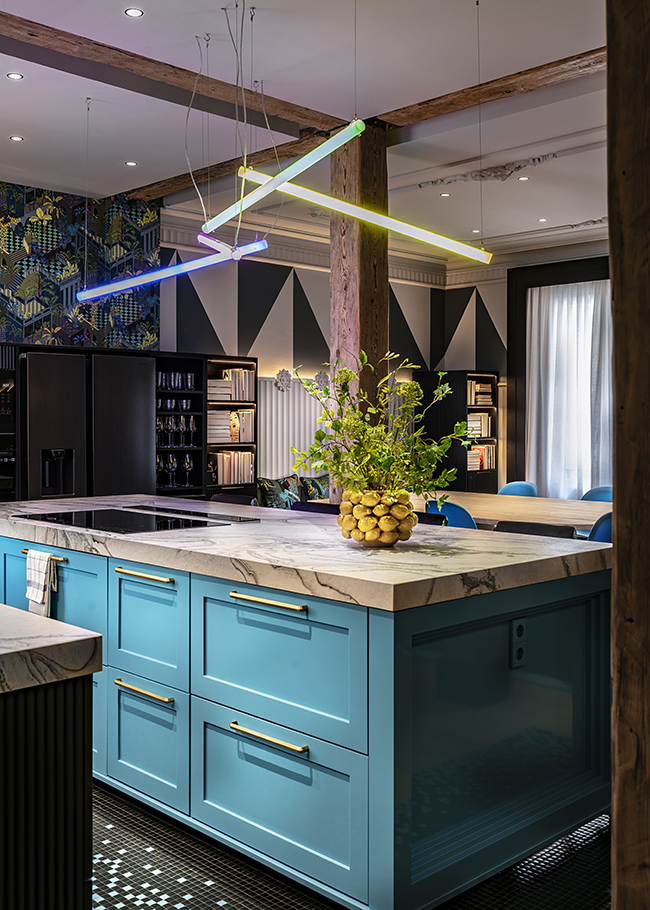 El diseño de la casa se inspira en la búsqueda de diversión y originalidad. Rompiendo con lo convencional y ofreciendo un espacio completamente diferente a lo habitual en Bilbao. El enfoque social se refleja en la distribución del espacio, con una amplia zona que integra la cocina, el comedor y el salón en un ambiente vibrante y lleno de color.
