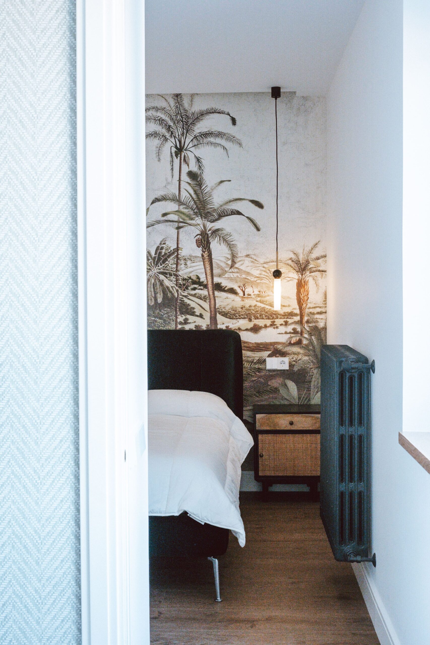 La habitación principal es “un lugar de descanso en el que mimamos la luz y el color dando protagonismo al cabecero con un precioso mural tropical”.