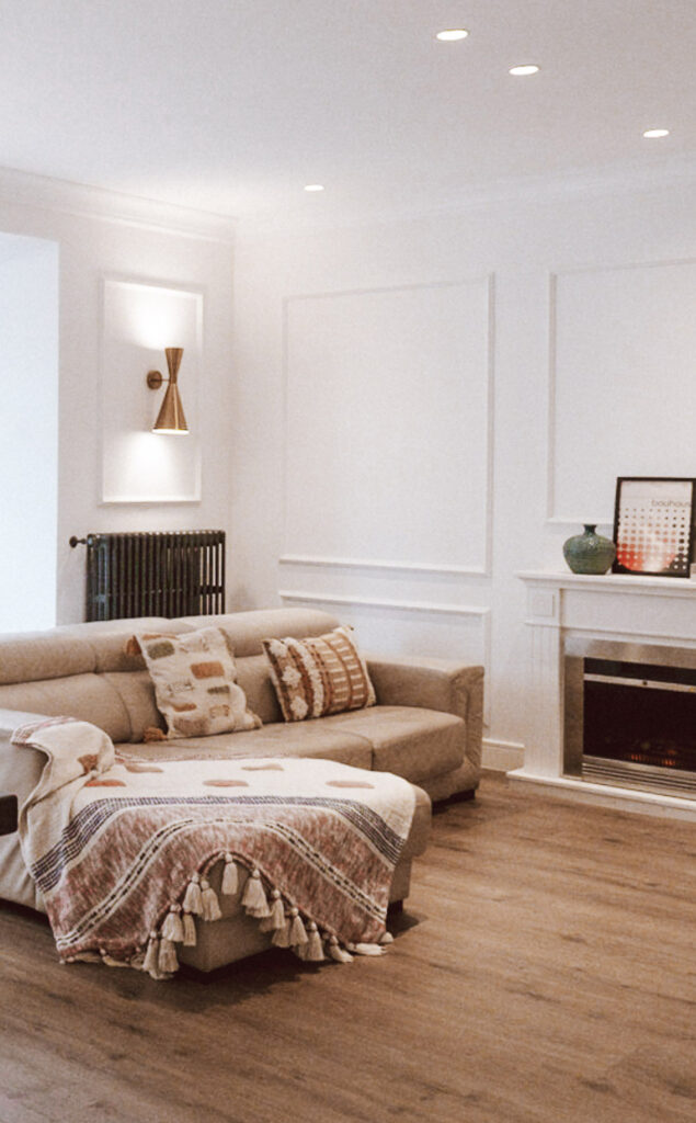 Al entrar en la vivienda encontramos espacios con techos altos. La entrada y el pasillo donde ya queda de manifiesto el protagonismo que las molduras de Orac decor van a tener en las estancias y la importancia de las lámparas y apliques de Crisal y Aromas del campo.