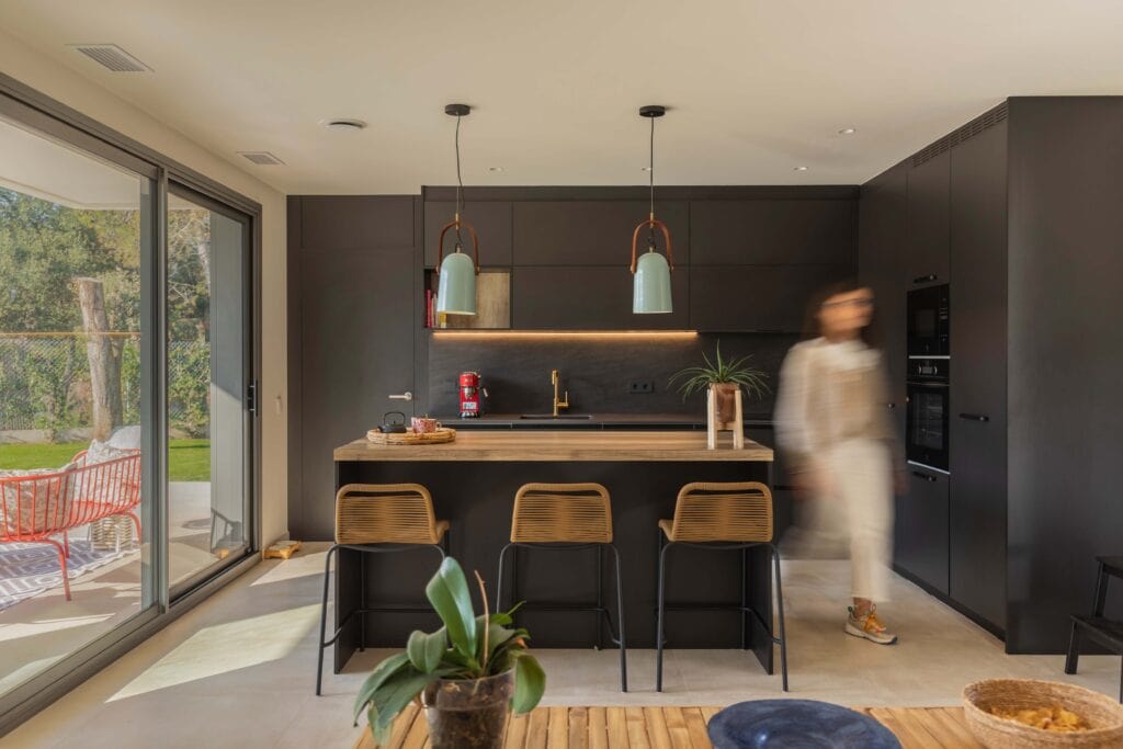 Empezando por la cocina, es un ejemplo perfecto de la combinación de estilo y funcionalidad. Con su color negro, se trata de una tendencia muy elegante y versátil que permite combinar con madera y destacar otros elementos y colores.