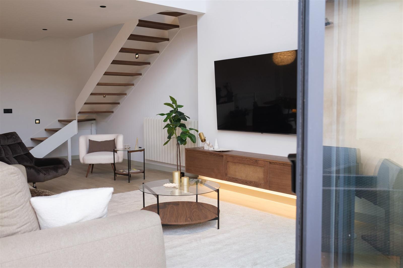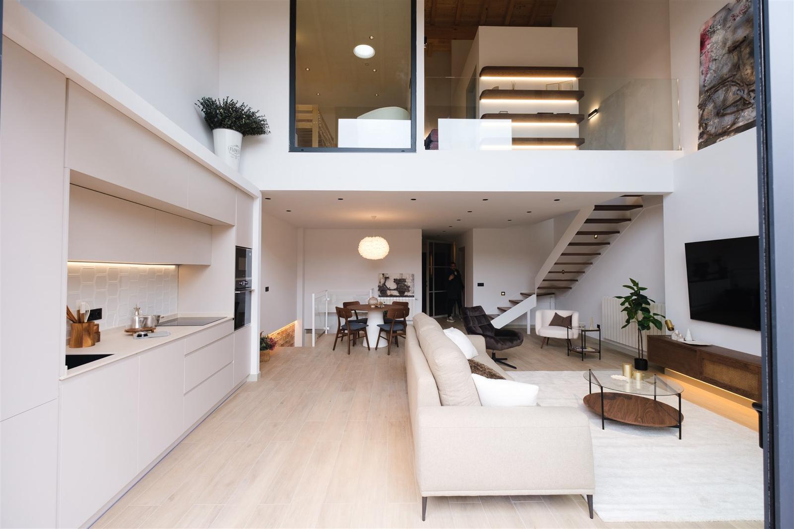 Al adentrarse en el interior, uno se encuentra con un concepto abierto en la planta baja. Este espacio principal alberga un amplio y acogedor salón, una cocina de diseño abierto y una sala de estar de ensueño. Además, en esta misma planta, se descubre una habitación principal bellamente diseñada y un baño espacioso, equipado con el elegante lavabo Circus de Bathco y una funcional lavadora y secadora integrada en un armario.