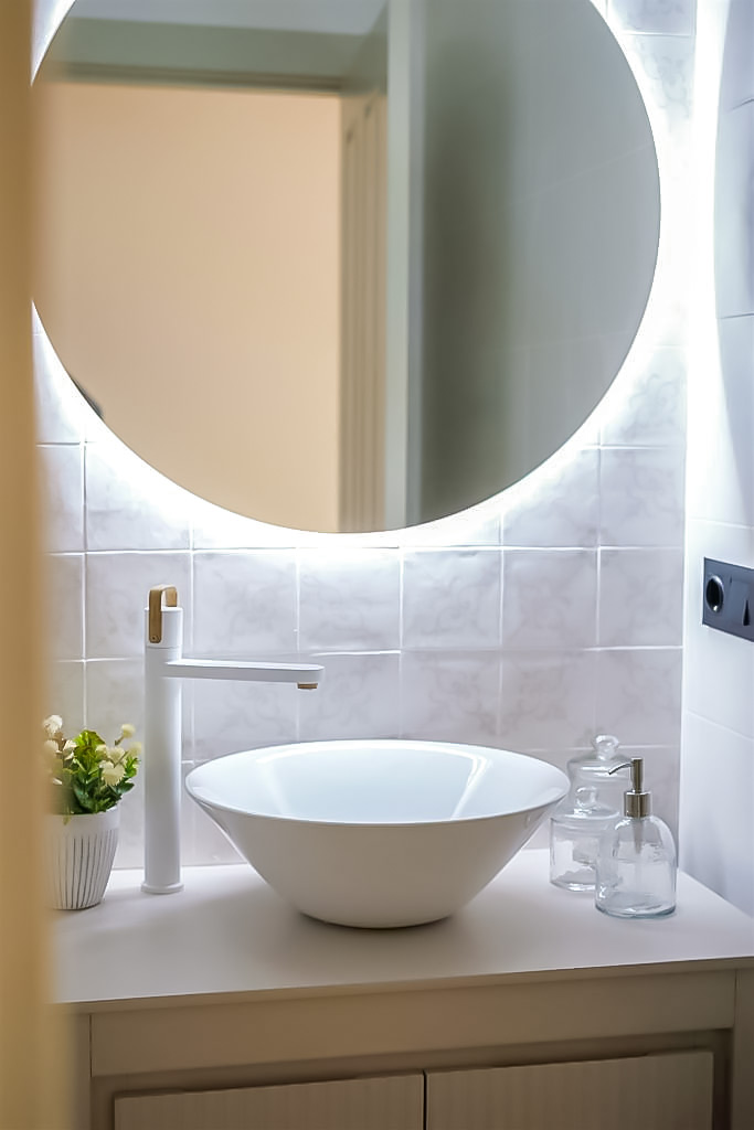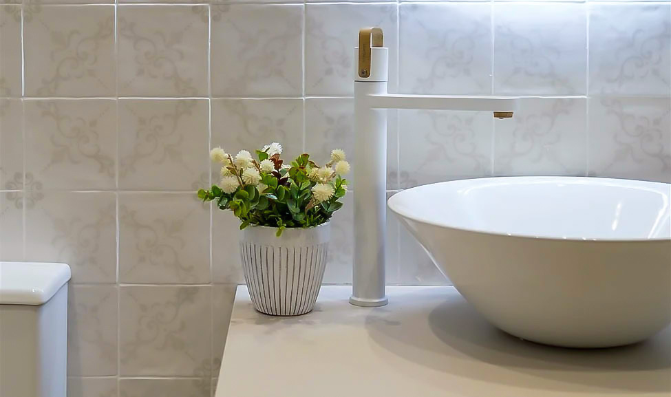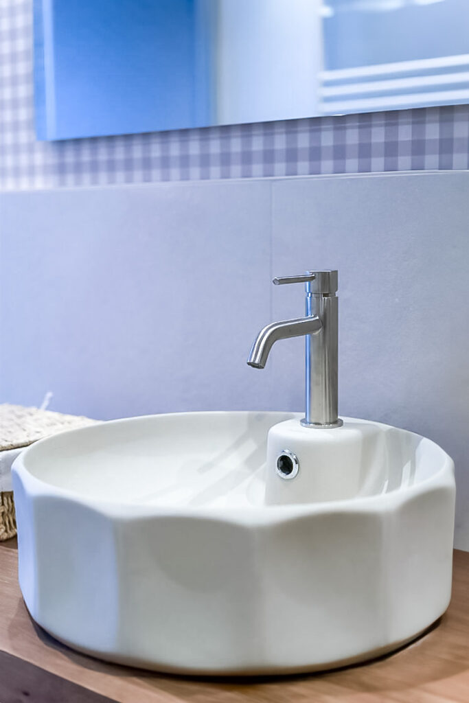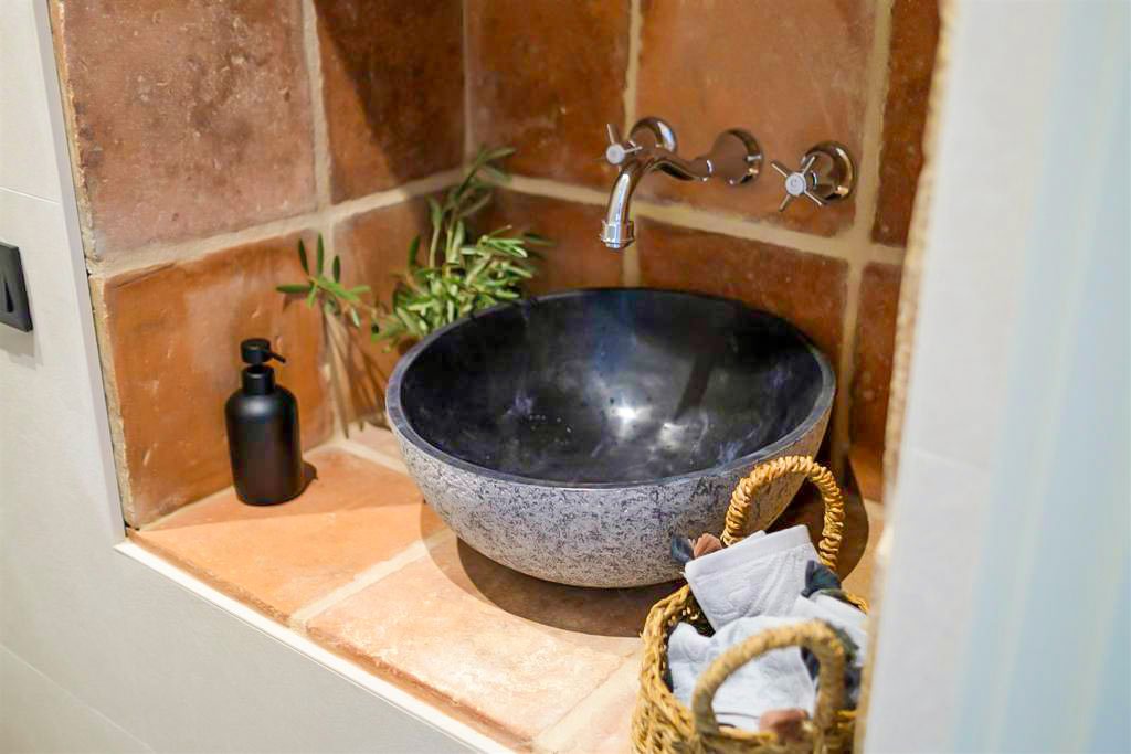 El baño de esta planta exhibe una combinación encantadora de azulejos irregulares y el lavabo Etna de Bathco, un homenaje a la antigüedad y la modernidad que coexisten armoniosamente en esta casa.