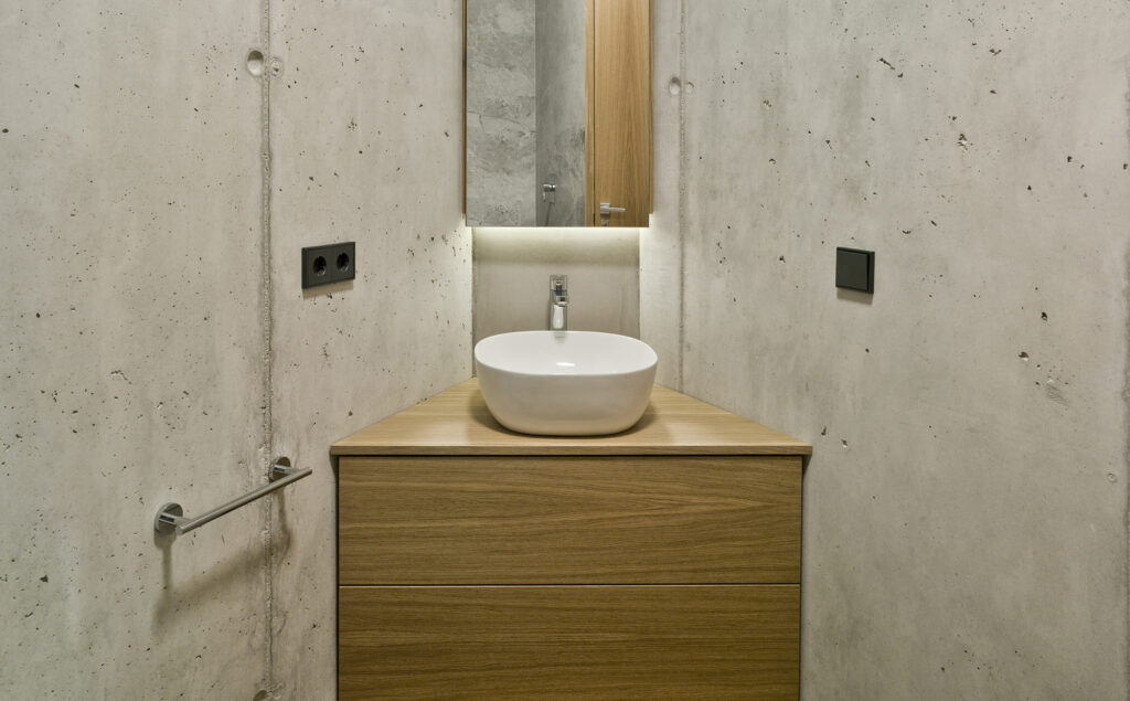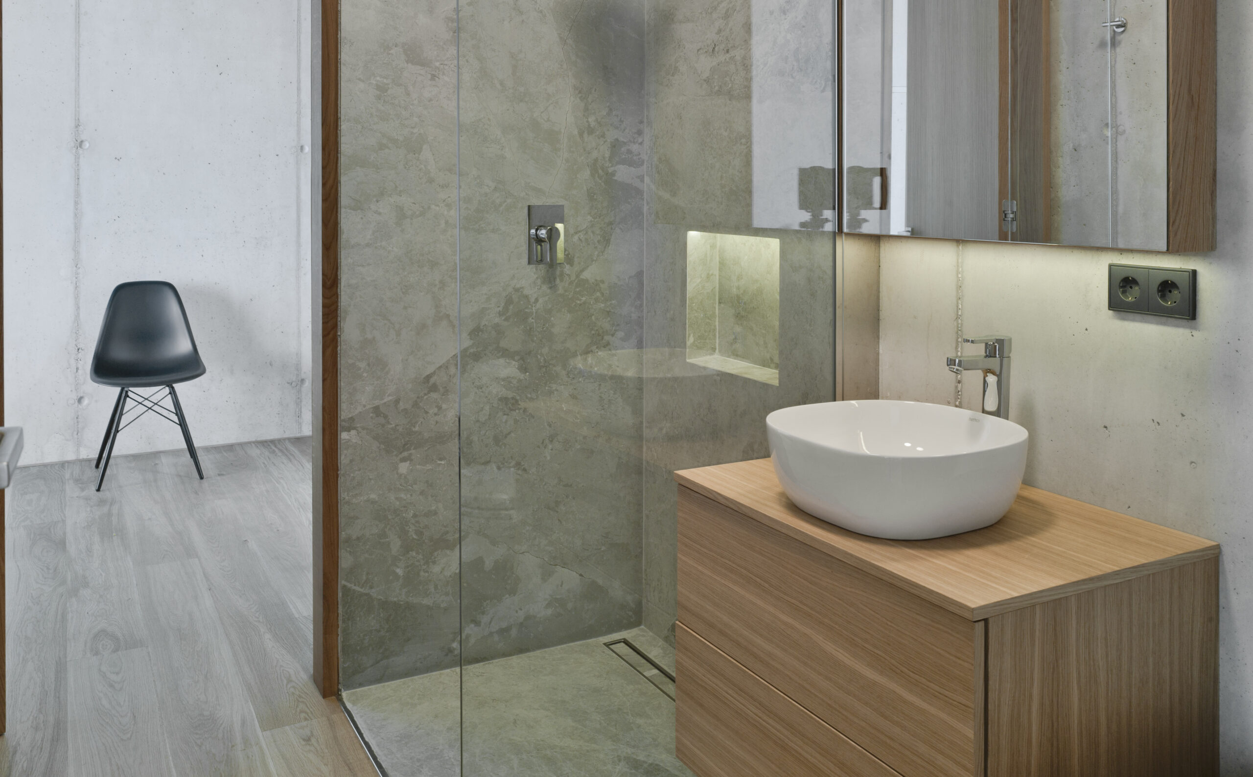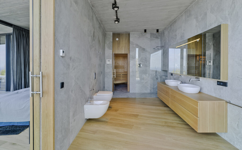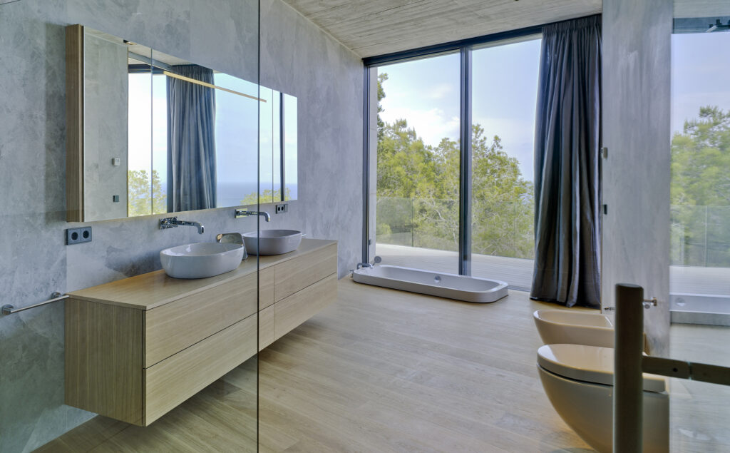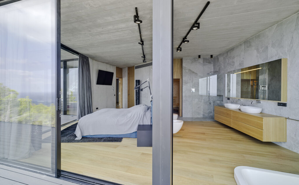 La planta baja, que queda enterrada bajo tierra a excepción del gran ventanal, acoge el ambiente de día y la suite dormitorio, que aprovecha las excepcionales vistas al mar. Anexo a ella se localiza el cuarto de baño principal, el cual se ha instalado un mueble de madera con dos lavabos Toulouse de Bathco. Mientas que en el aseo se ha colocado un lavabo Olea cuadrado sobre un mueble a medida que aprovecha el espacio terminado en esquina.