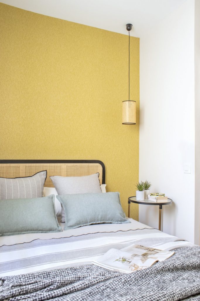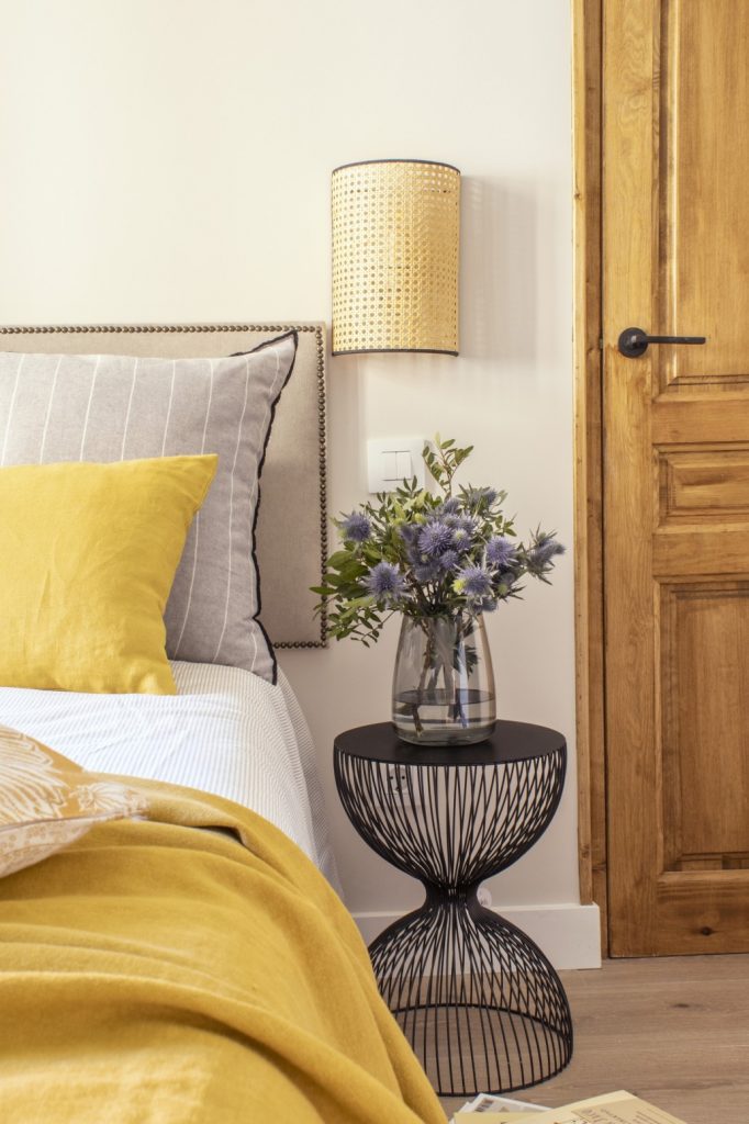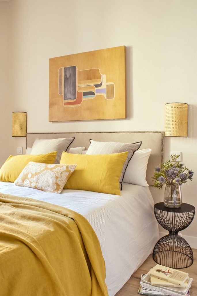 Para los dormitorios, la clave fue escoger colores potentes dando protagonismo al amarillo. En el dormitorio principal lo vemos en los textiles de la cama flanqueada por apliques de pared y coronada por una obra de Jesús Perea. Las mesitas de noche son de Maison du Monde.