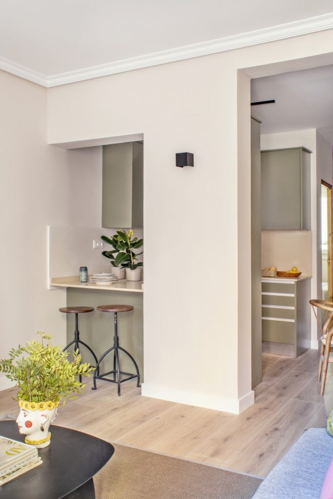 De ahí pasamos a la cocina abierta al salón con barra para dos con sillas de Maisons du monde. El color elegido para este espacio fue el verde presente en todos los muebles.