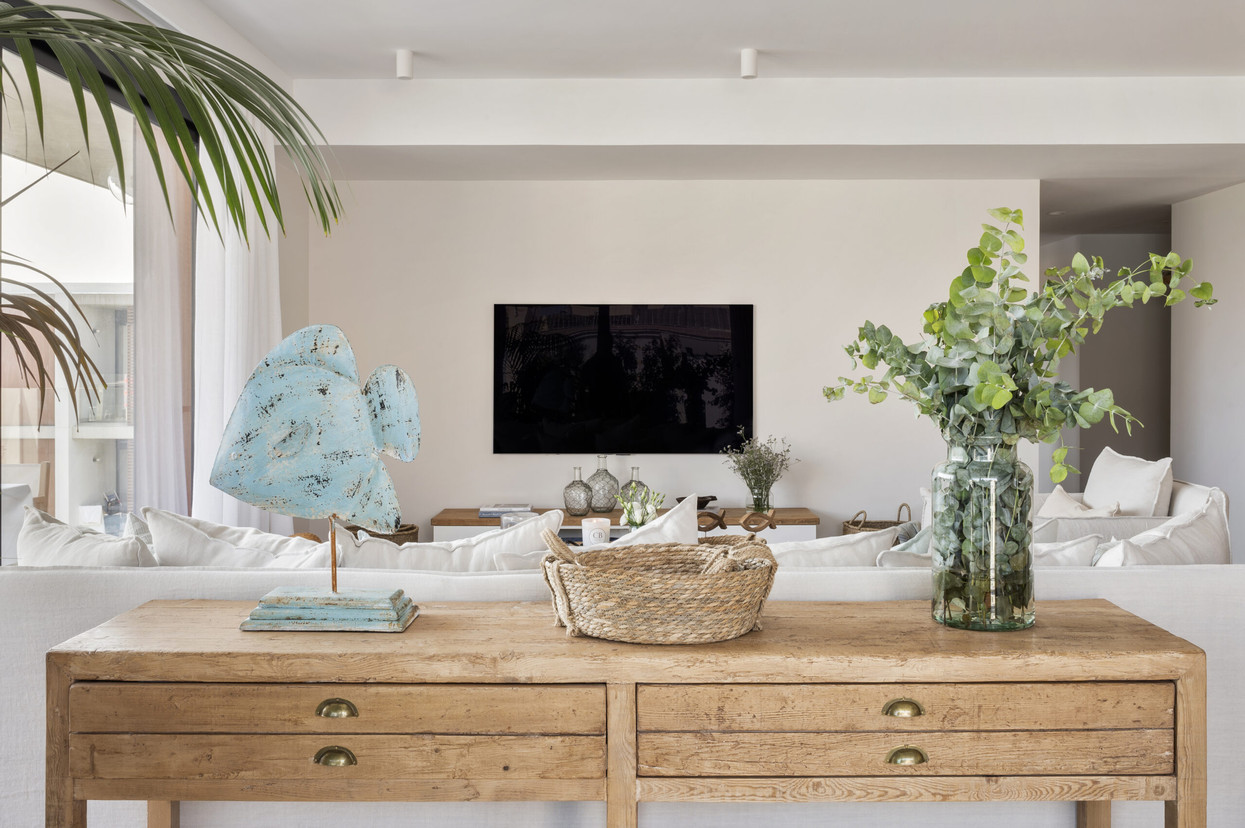 - Consola de madera: Situada detrás del sofá, aporta calidez y funcionalidad al espacio.