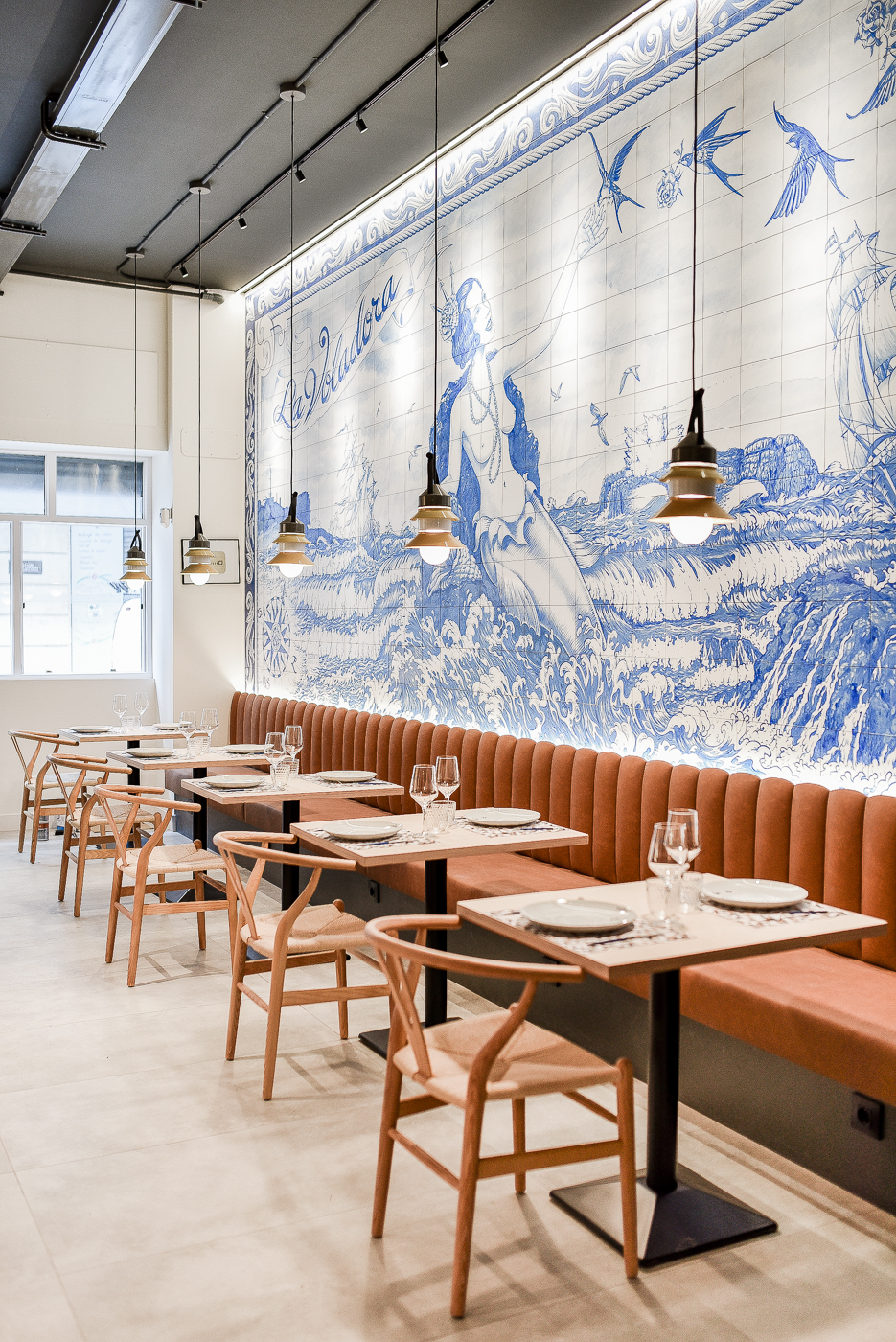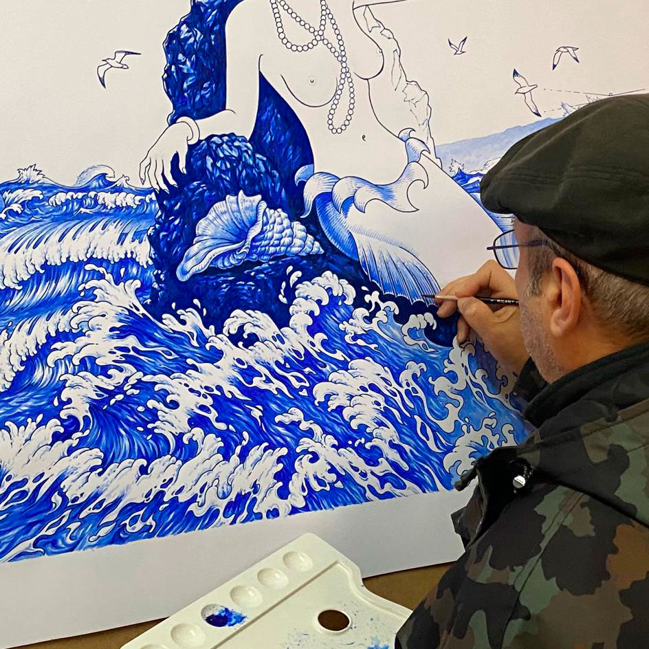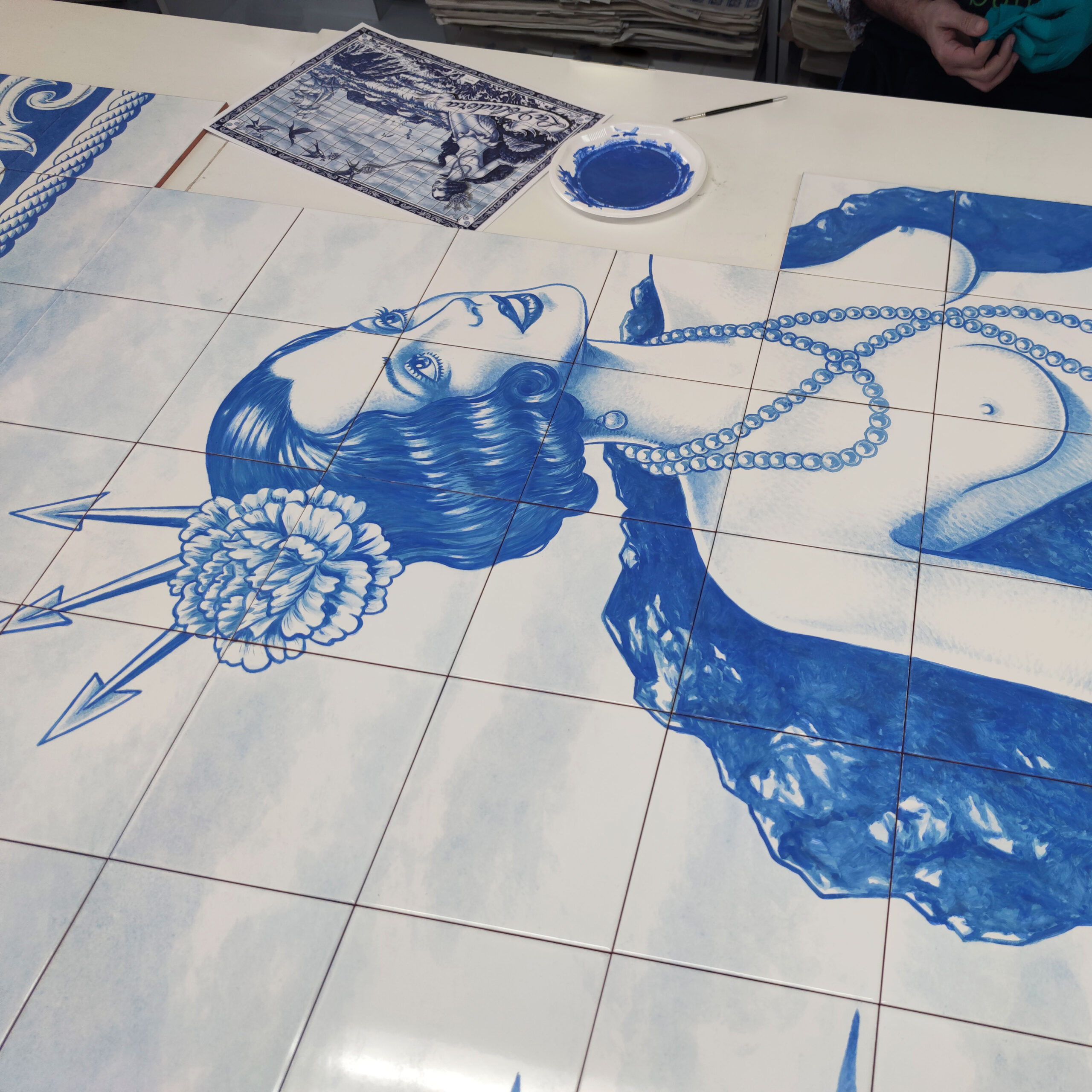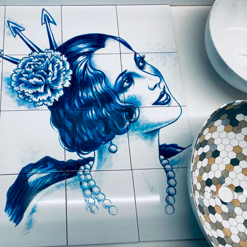Fueron los artistas de Bathco Atelier quienes reprodujeron esa ilustración a escala para lograr un gran mural de casi 7 metros de largo formado por azulejos de 20×20 cm. El proceso comenzó con la digitalización parapoder adaptar el dibujo a los azulejos como si de un puzle se tratase. Tras esto, se imprimieron las calcas cerámicas que se colocaron sobre la porcelana de forma artesanal gracias a las manos expertas denuestro taller. Para reavivar el azul añil tan típico de la porcelana portuguesa, los artistas enriquecieron el mural pintándolo a mano alzada y dando vida a esa mujer que se ha convertido en heroína.