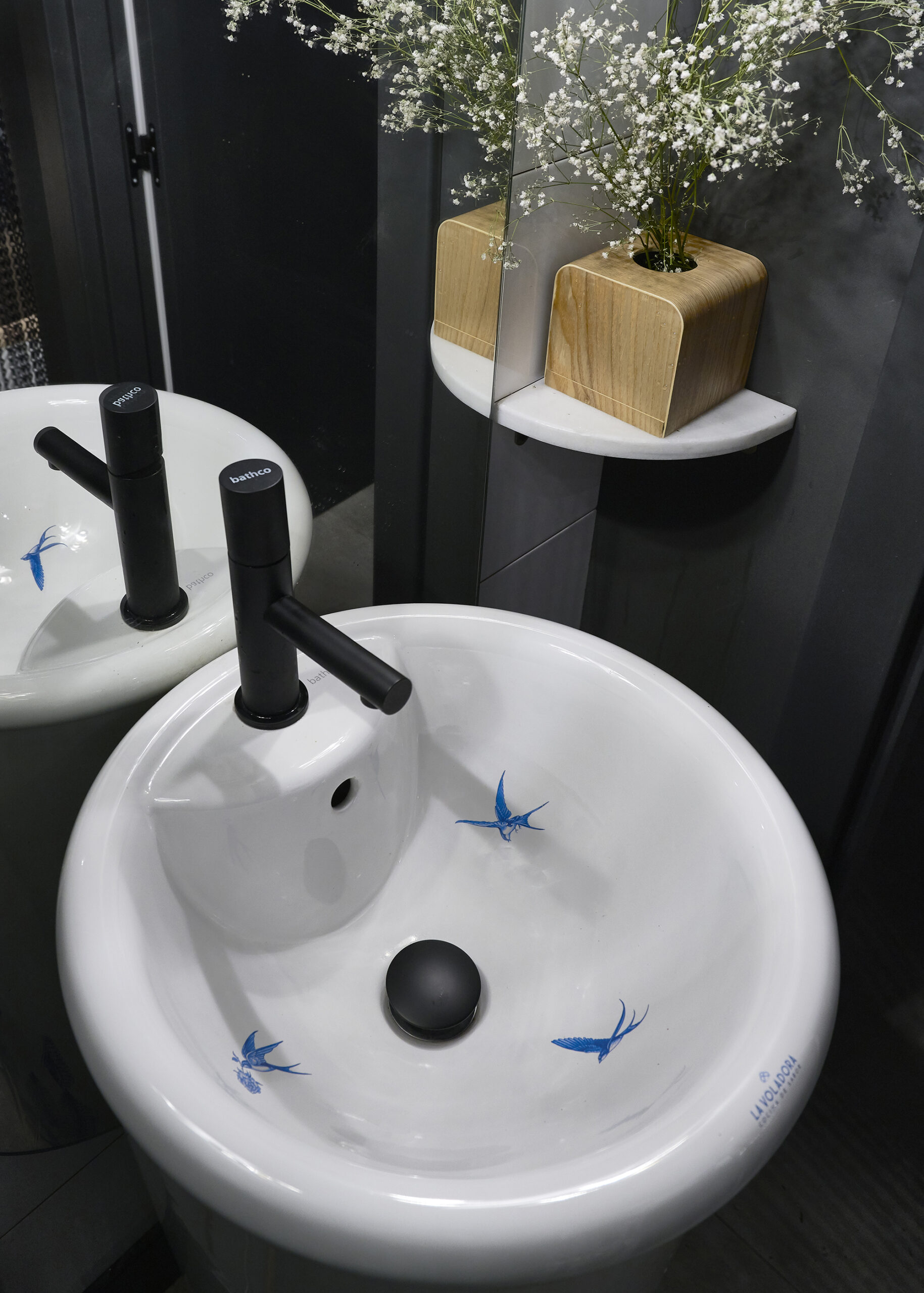 Lavabos Roma y Jerez de porcelana intervenidos por los artistas de Bathco Atelier. Inodoro suspendido Piamonte. Grifería negro mate Iconos.